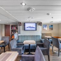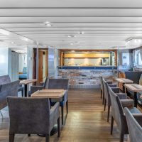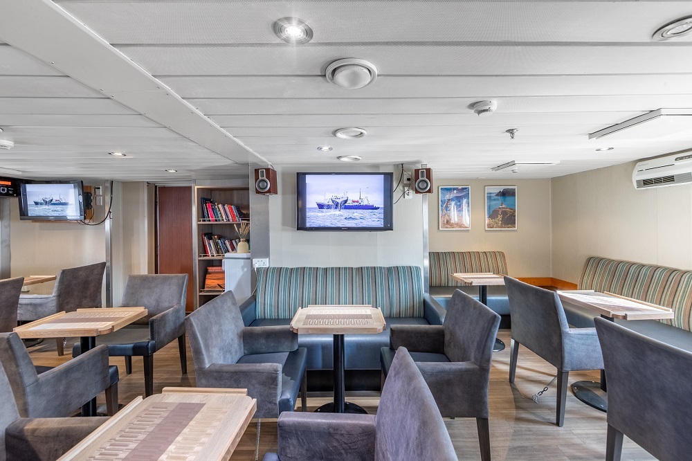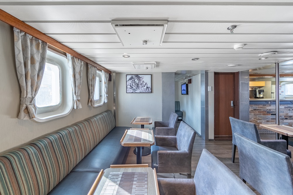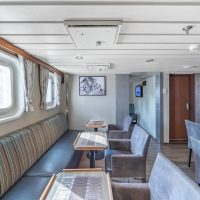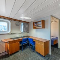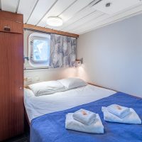 В каюте: двухъярусная кровать, ванная комната (раковина, душ, туалет), шкаф для одежды, письменный стол, тумбочки, обзорное окно.