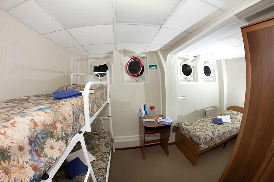 В каюте: одна односпальная кровать, одна двухъярусная кровать, ванная комната (раковина, душ, туалет), стол, навесная полка, шкаф для одежды, обзорное окно.