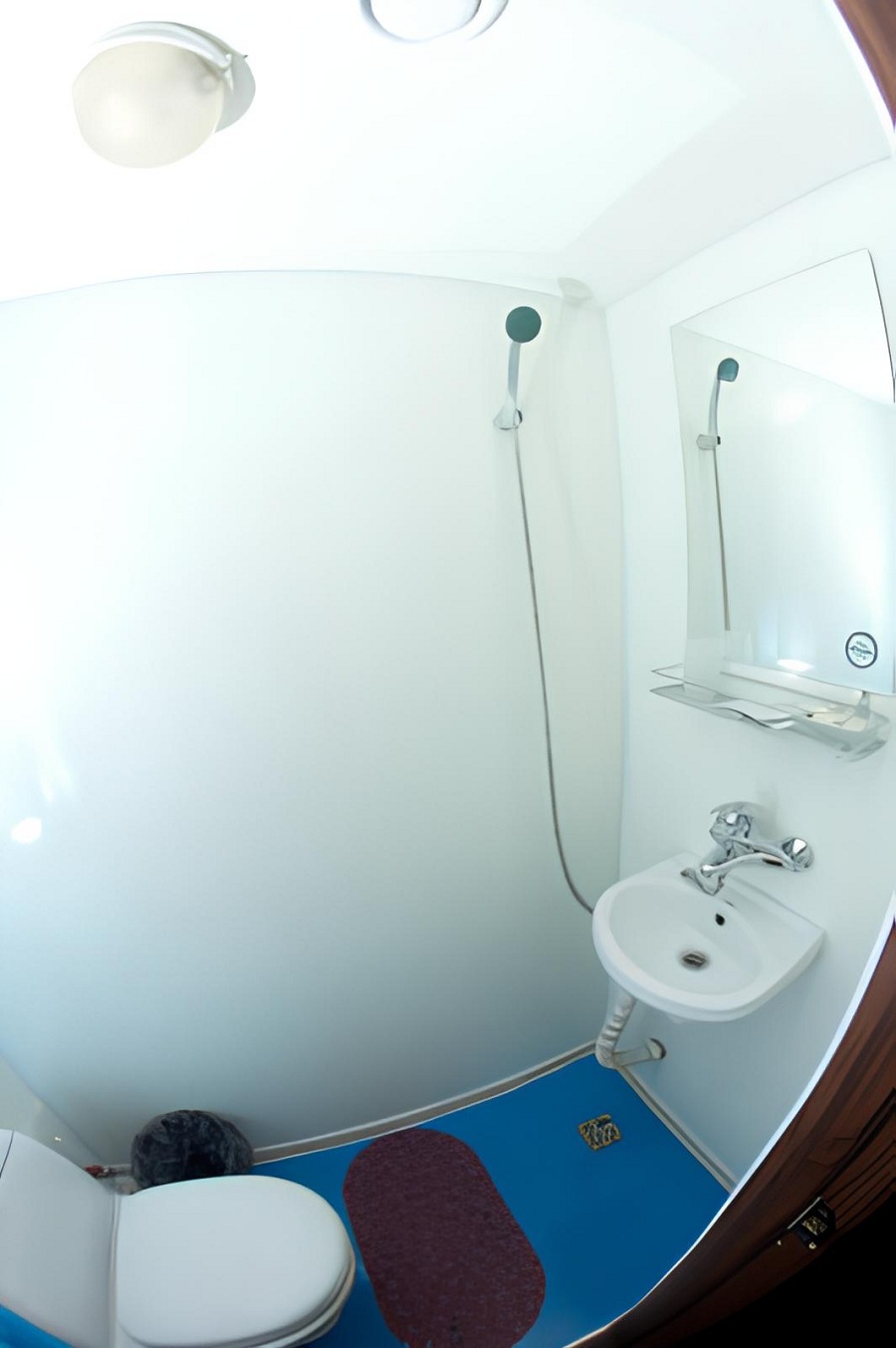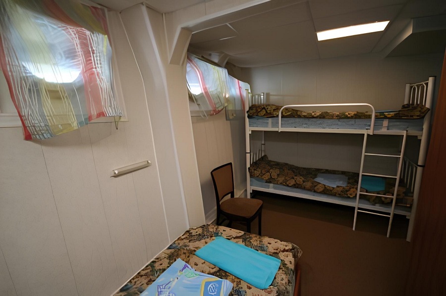 В каюте: односпальная кровать, двухъярусная кровать, ванная комната (раковина, душ, туалет), шкаф для одежды, иллюминаторы.