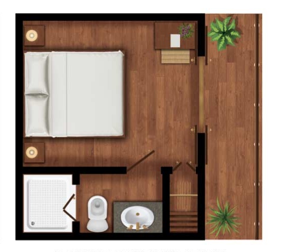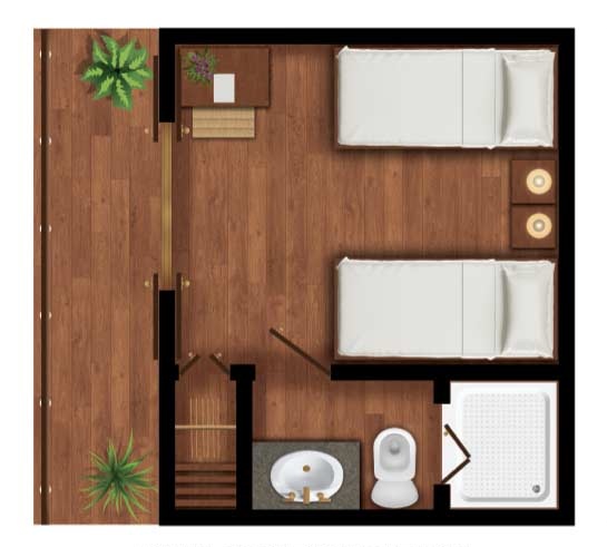 В каюте: одна двуспальная кровать (при необходимости трансформируется в две односпальные кровати), ванная комната (раковина, душ, туалет), ежедневное пополнение воды, кондиционер с индивидуальным управлением, мини-бар, фен, зеркало, банные халаты, тапочки, мини-сейф, розетки, дверь с панорамным окном и выходом на палубу.