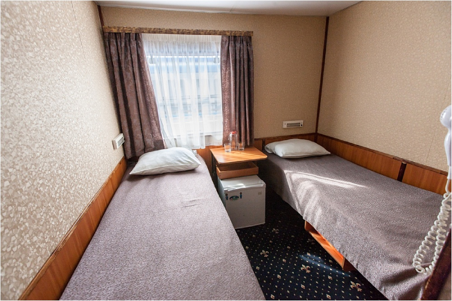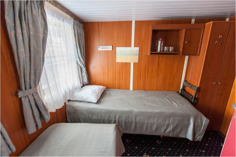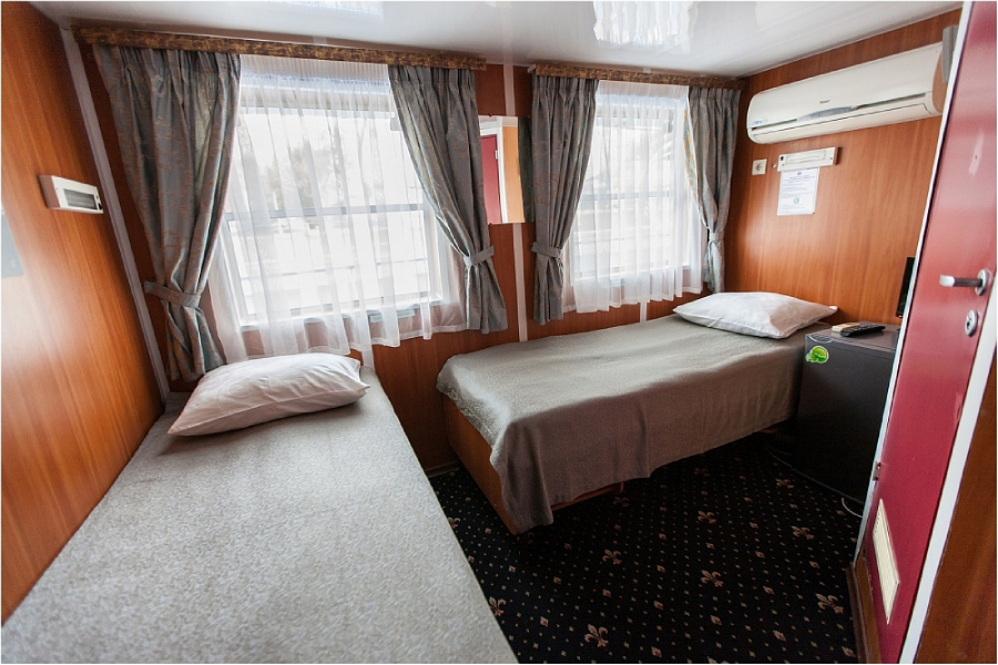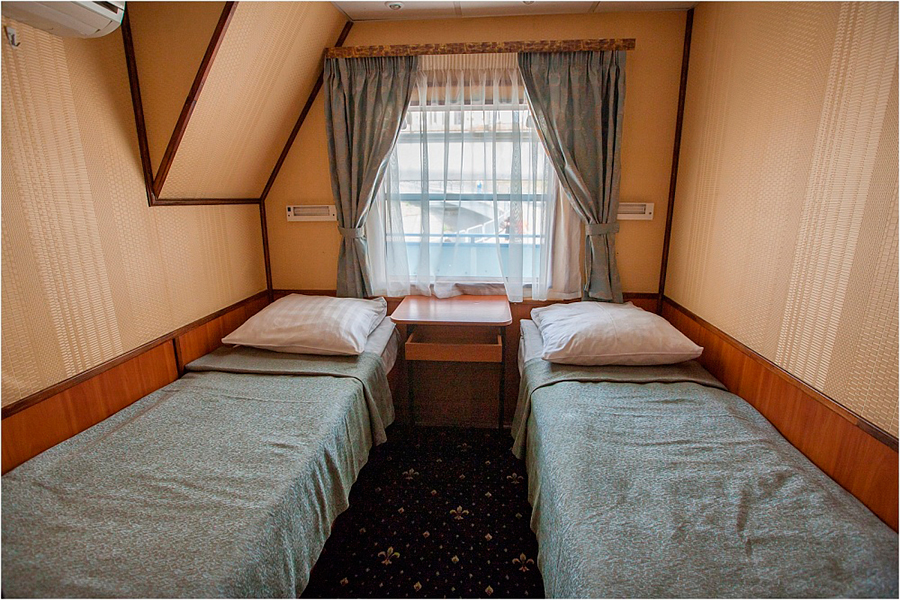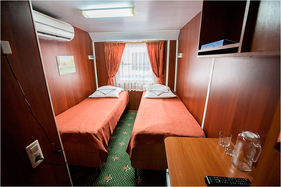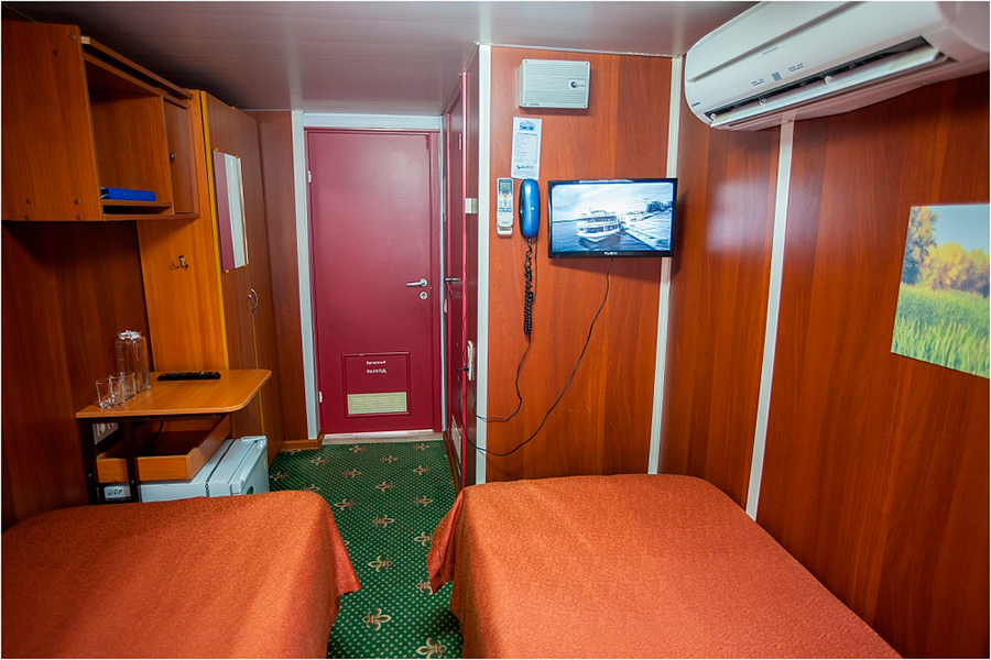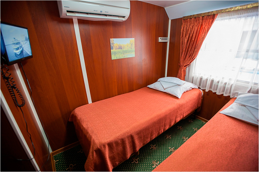 В каюте: две односпальные кровати, ванная комната (раковина, душ, туалет), корпусная мебель, кондиционер, холодильник, телевизор, телефон, обзорное окно.