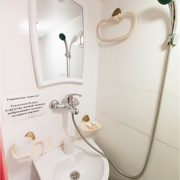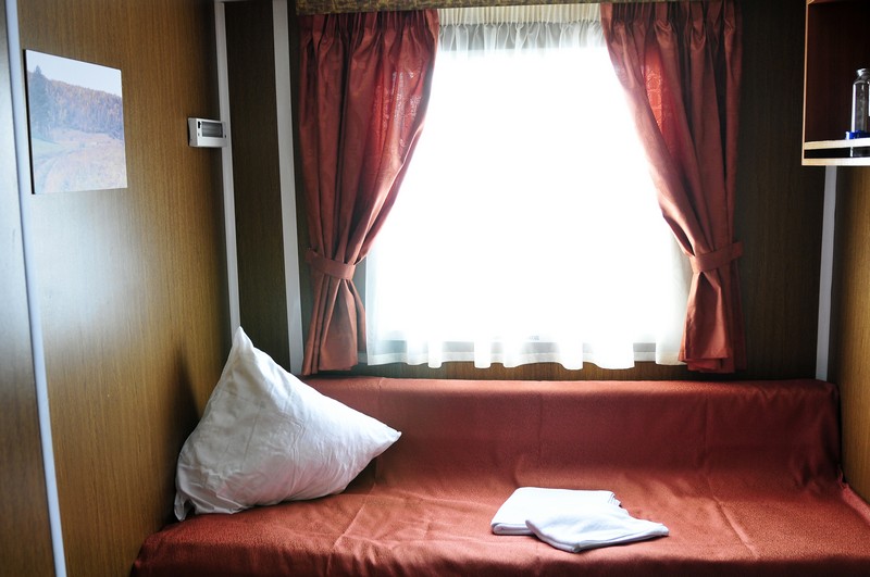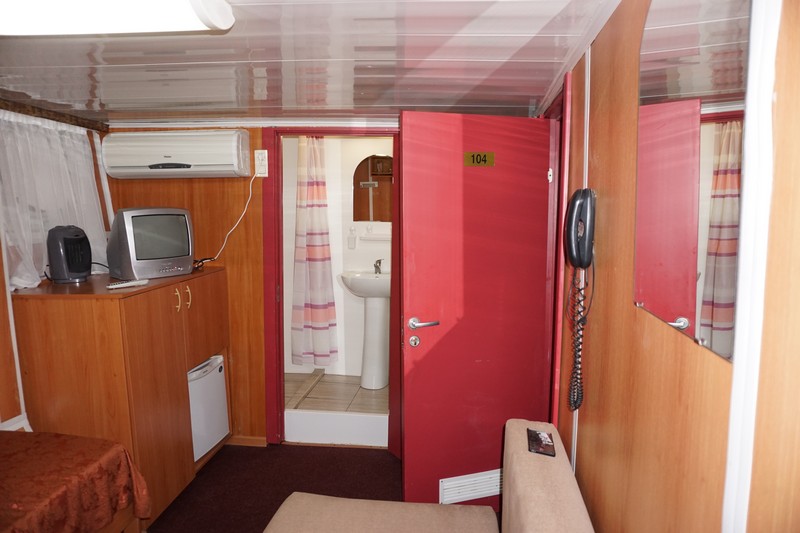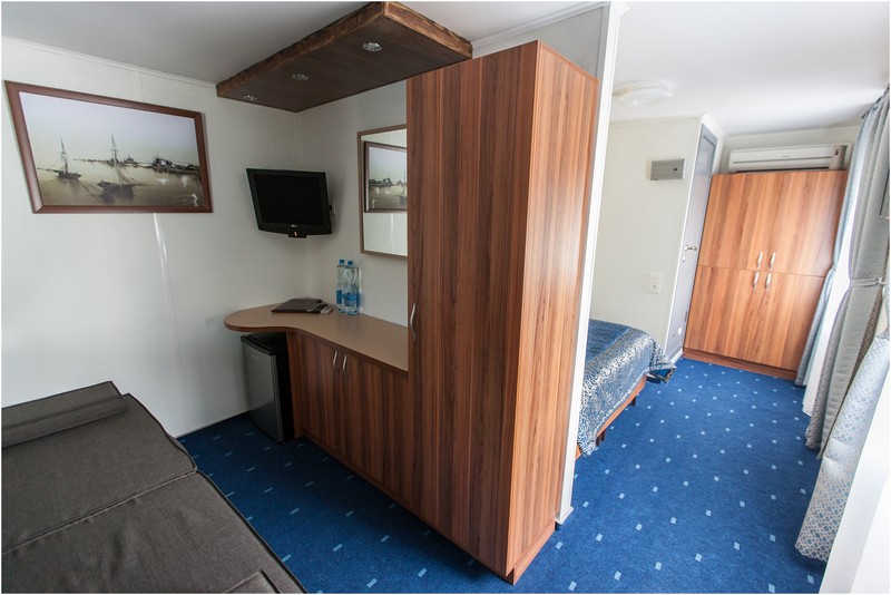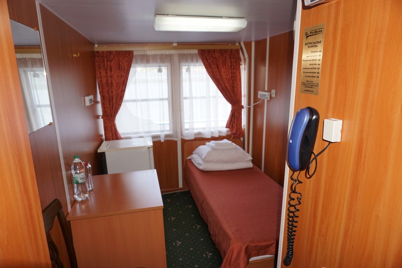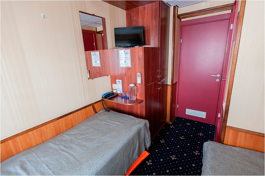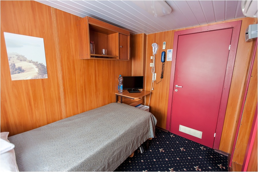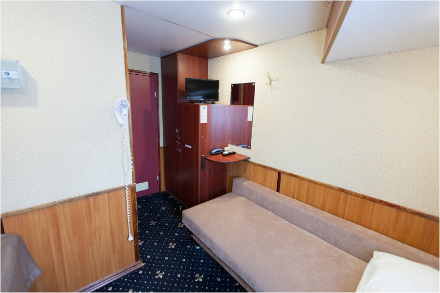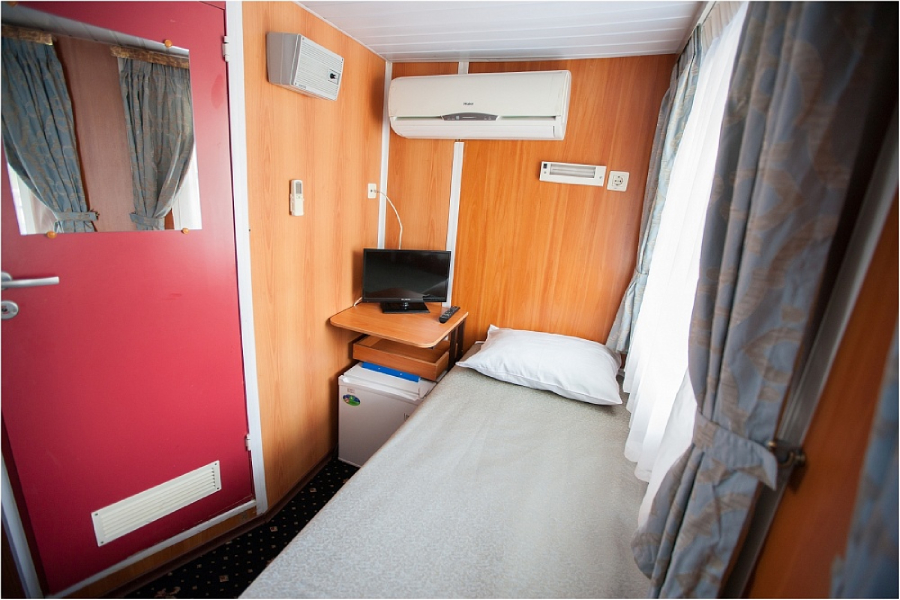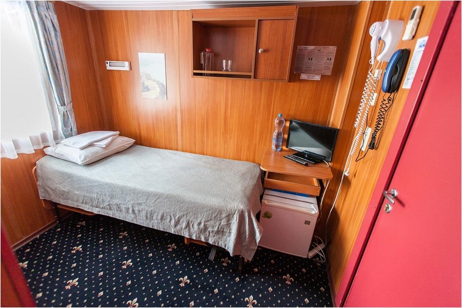 В каюте: односпальная кровать, ванная комната (раковина, душ, туалет), кондиционер, холодильник, телевизор, телефон, шкаф для одежды, обзорные окна.