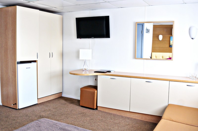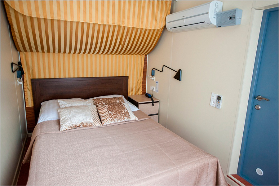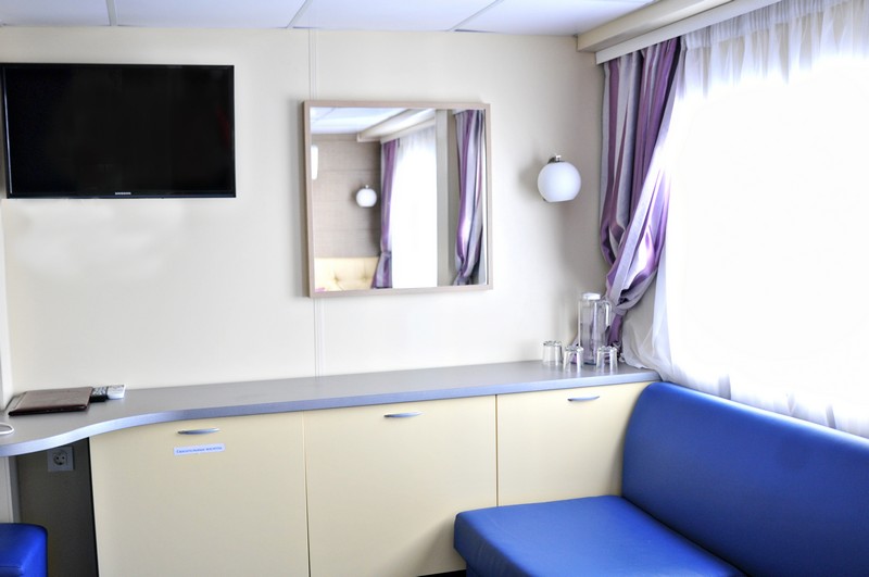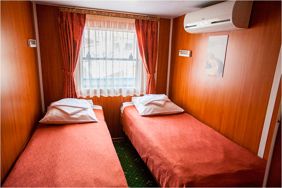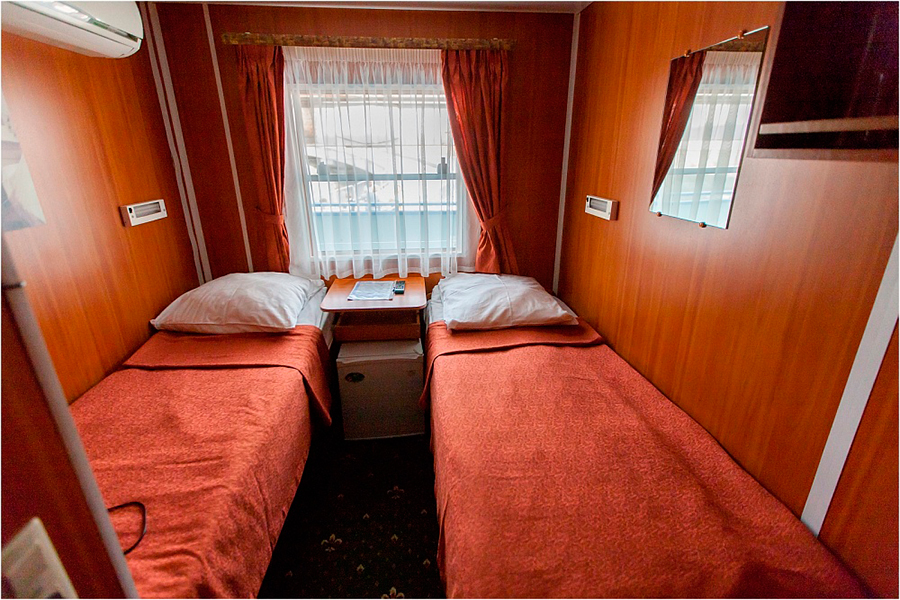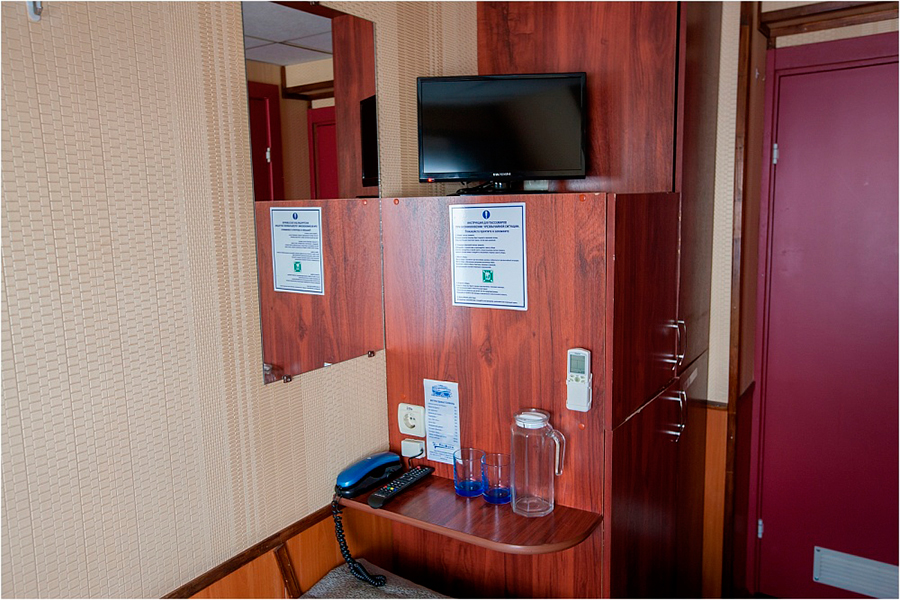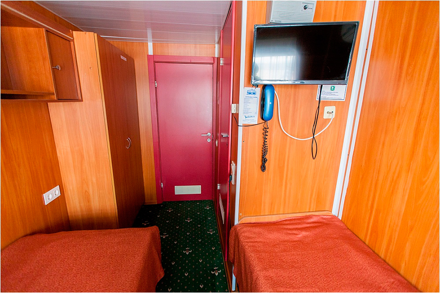 В каюте: две односпальные кровати, корпусная мебель, ванная комната (раковина, душ, туалет), шкаф для одежды, кондиционер, телефон, холодильник, телевизор, обзорное окно.