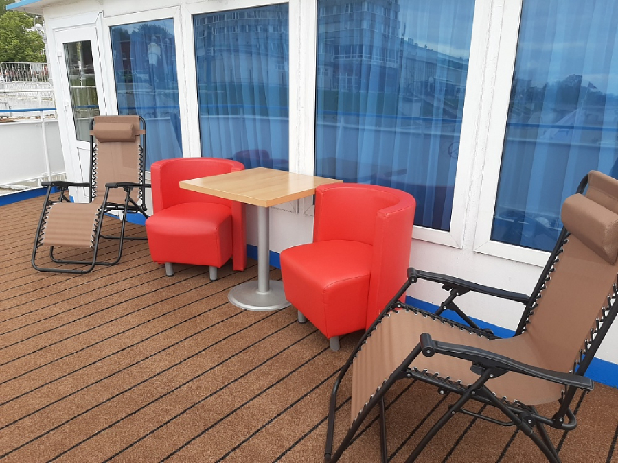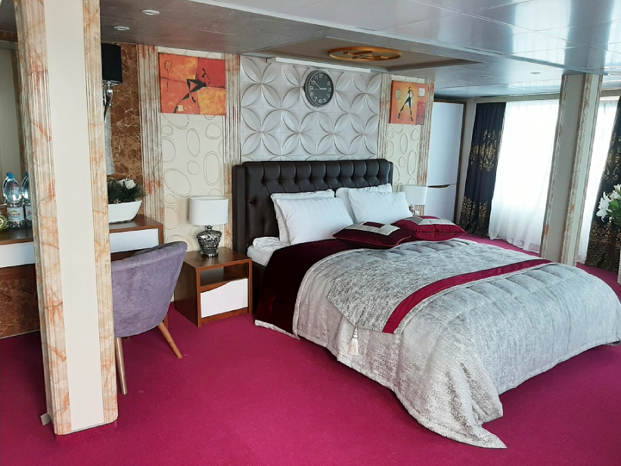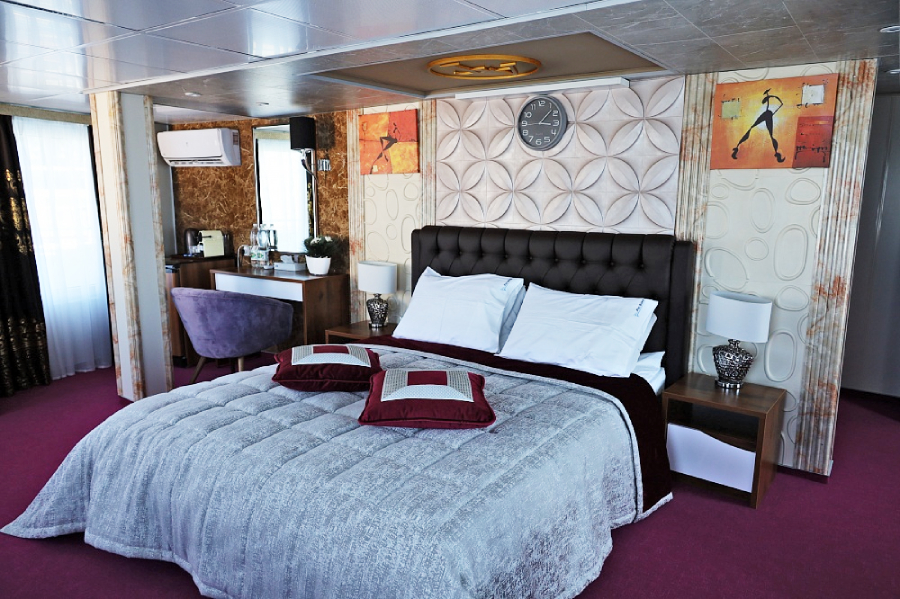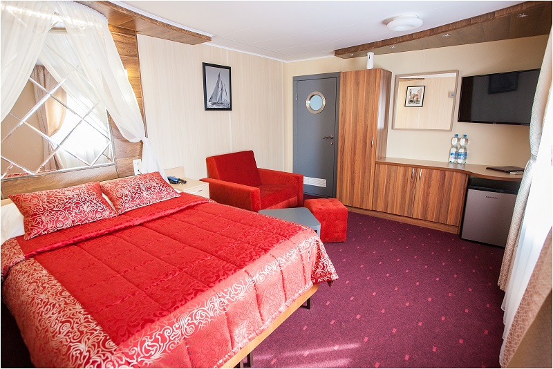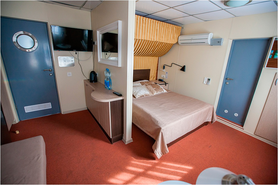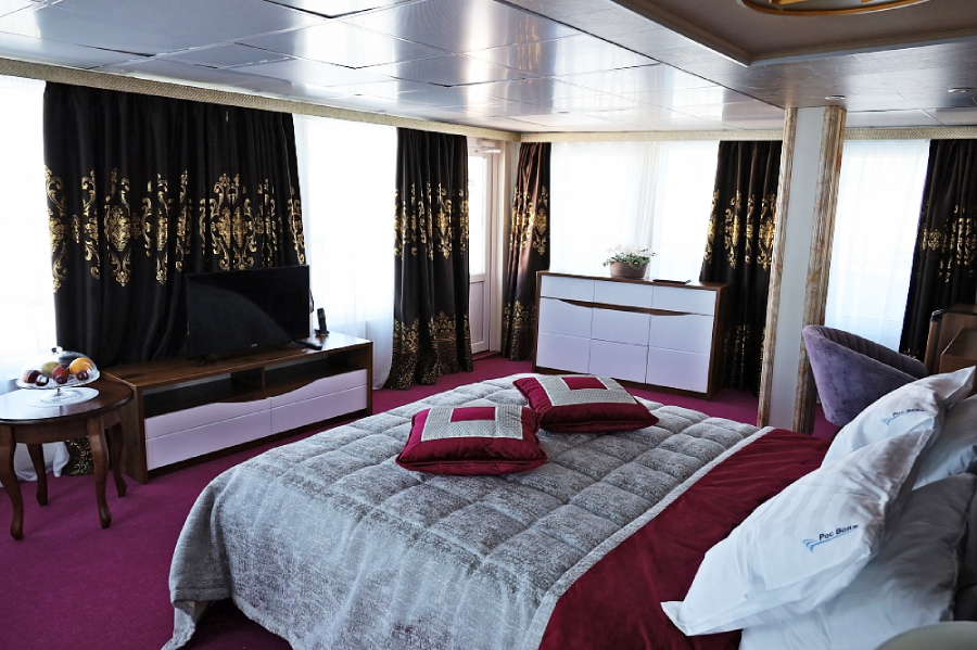 В каюте: двуспальная кровать, ванная комната (раковина, душевая кабина, туалет), раздвижной диван, шкаф для одежды, комод, журнальный столик, кондиционер, холодильник, телевизор, телефон, фен, набор посуды и приборов, WI-FI, панорамные окна по всему периметру, индивидуальный выход на палубу и собственная зона отдыха с палубной мебелью и шезлонгами.