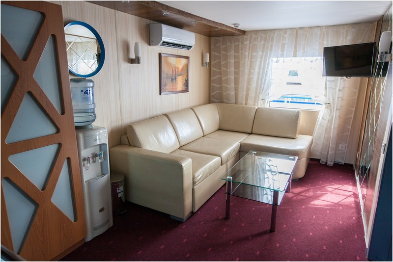 В холле (на две каюты): диван, телевизор, журнальный стол, кулер с горячей и холодной водой, шкаф для чемоданов или верхней одежды, кондиционер, обзорное окно.