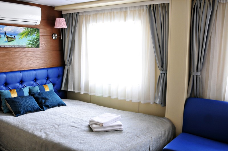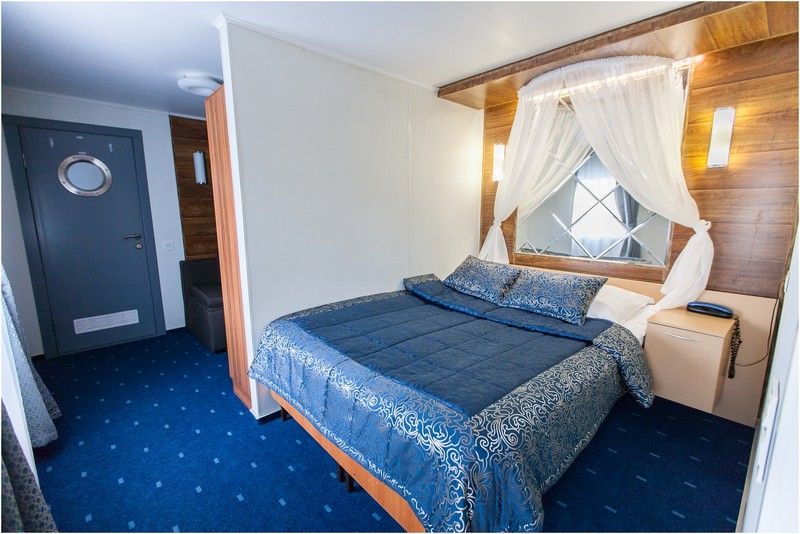 В каюте: двуспальная кровать, ванная комната (раковина, душевая кабина, туалет), диван, кондиционер, холодильник, телевизор, телефон, корпусная мебель, фен, набор посуды и приборов, обзорные окна.
