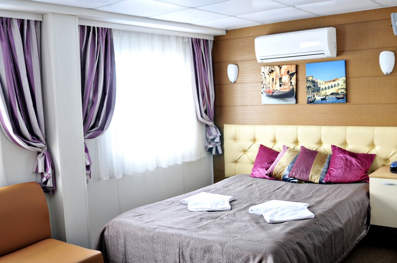 В каюте: двуспальная кровать, раздвижной диван, шкаф для одежды, ванная комната (раковина, душ, туалет), кондиционер, холодильник, телевизор, телефон, фен, обзорные окна.