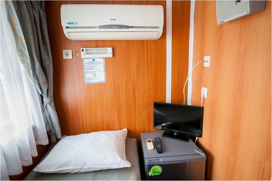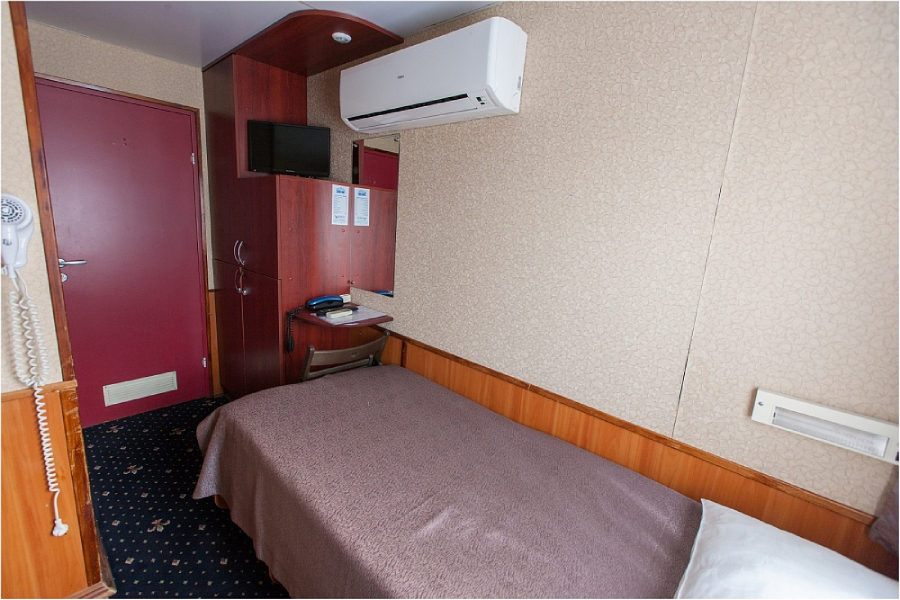 В каюте: односпальная кровать, ванная комната (раковина, душ, туалет), кондиционер, холодильник, телефон, телевизор, фен, шкаф для одежды, обзорное окно.
