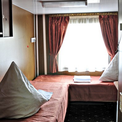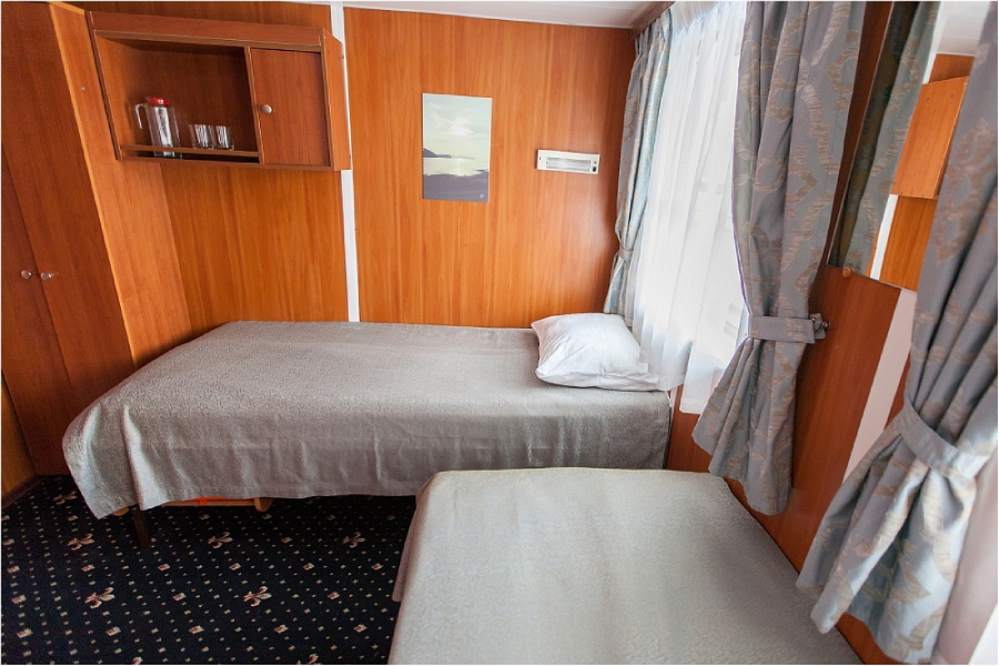 В каюте: две односпальные кровати, ванная комната (раковина, душ, туалет), кондиционер, телевизор, телефон, холодильник, шкаф для одежды, обзорное окно.