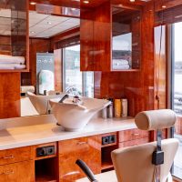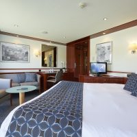 В каюте: двуспальная кровать, ванная комната (раковина, душ, туалет), комплект полотенец, фен, диван, кресло, стол, шкаф для одежды, холодильник, спутниковое телевидение, телефон внутренней связи, радио, сейф, кондиционер, стеклянная балконная дверь, французский балкон.