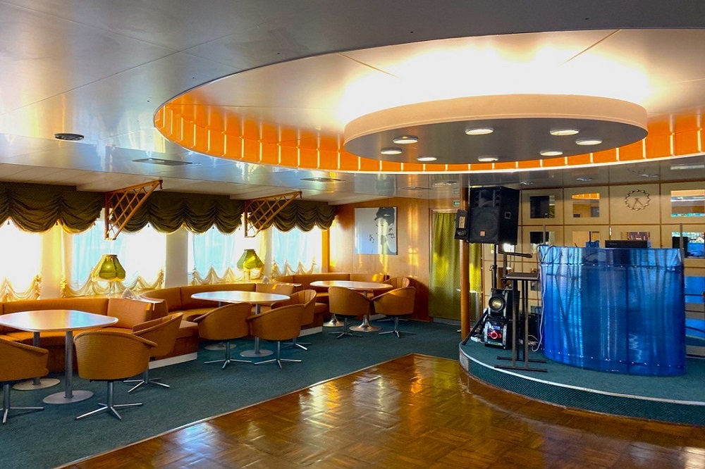 В каюте: две односпальные кровати, ванная комната (раковина, душ, туалет), шкаф для одежды, кондиционер, холодильник, радио, розетка 220 V, окно.