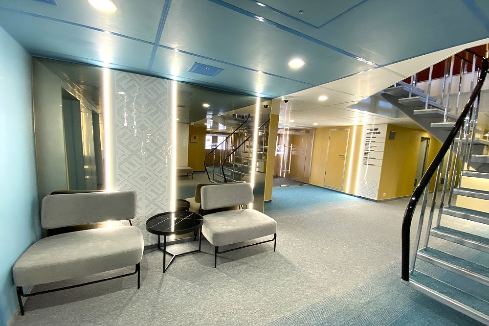 В каюте: двуспальная кровать, двухспальный диван, ванная комната (раковина, душ, туалет), кресло, шкаф для одежды, кондиционер, холодильник, радио, спутниковое ТВ и DVD, розетка 220 V, четыре обзорных окна.