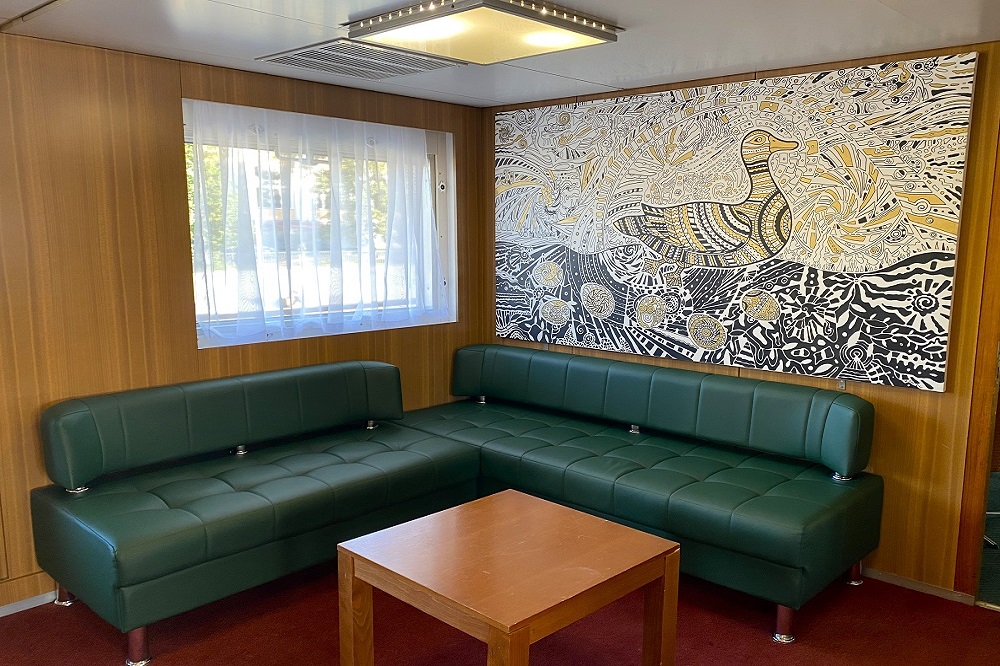В каюте: две односпальные кровати и одно спальное место верхнего расположения, ванная комната (раковина, душ, туалет), шкаф для одежды, кондиционер, холодильник, радио, розетка 220 V, обзорное окно.