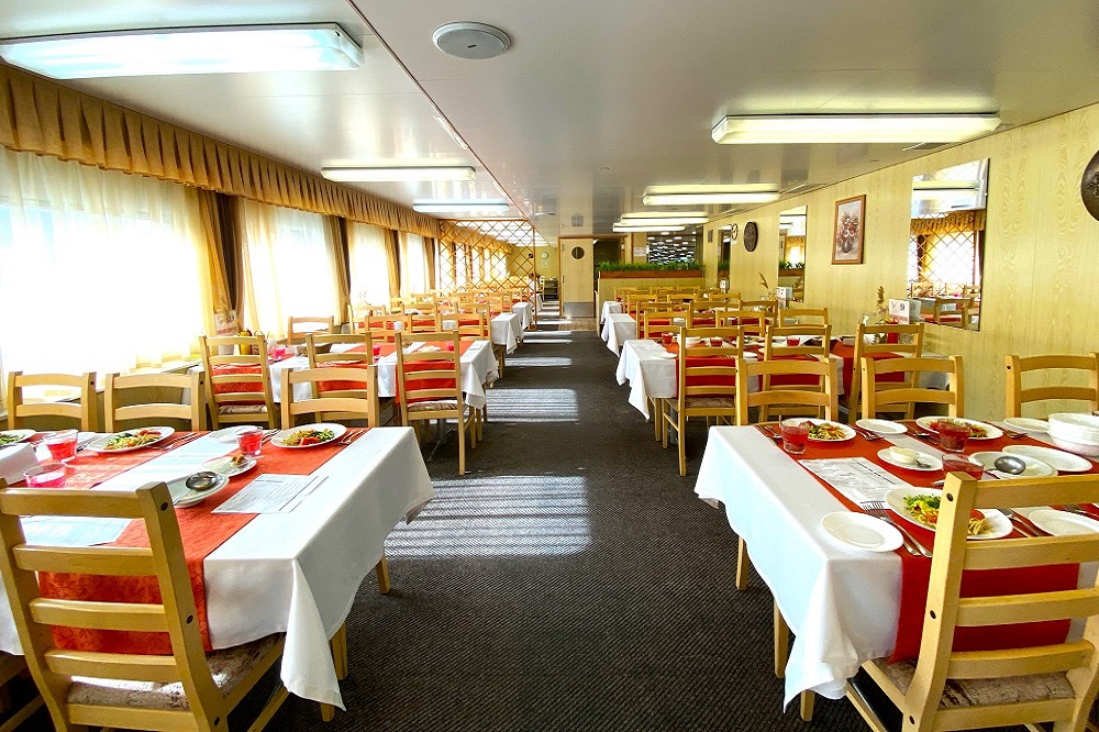 В каюте: односпальная кровать, ванная комната (раковина, душ, туалет), шкаф для одежды, кондиционер, холодильник, радио, розетка 220 V, обзорное окно.