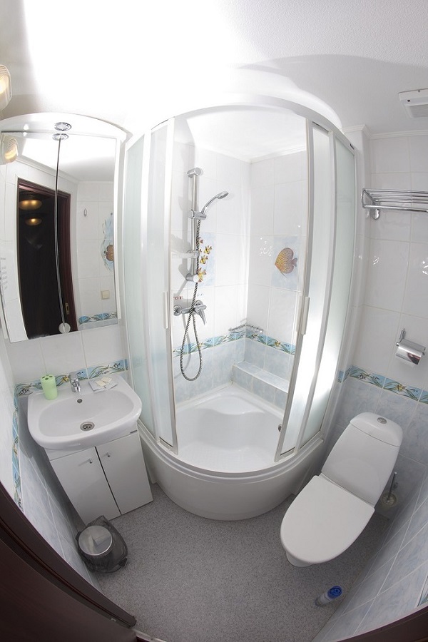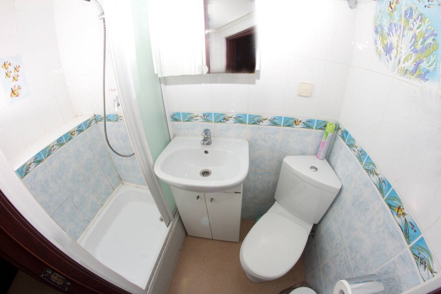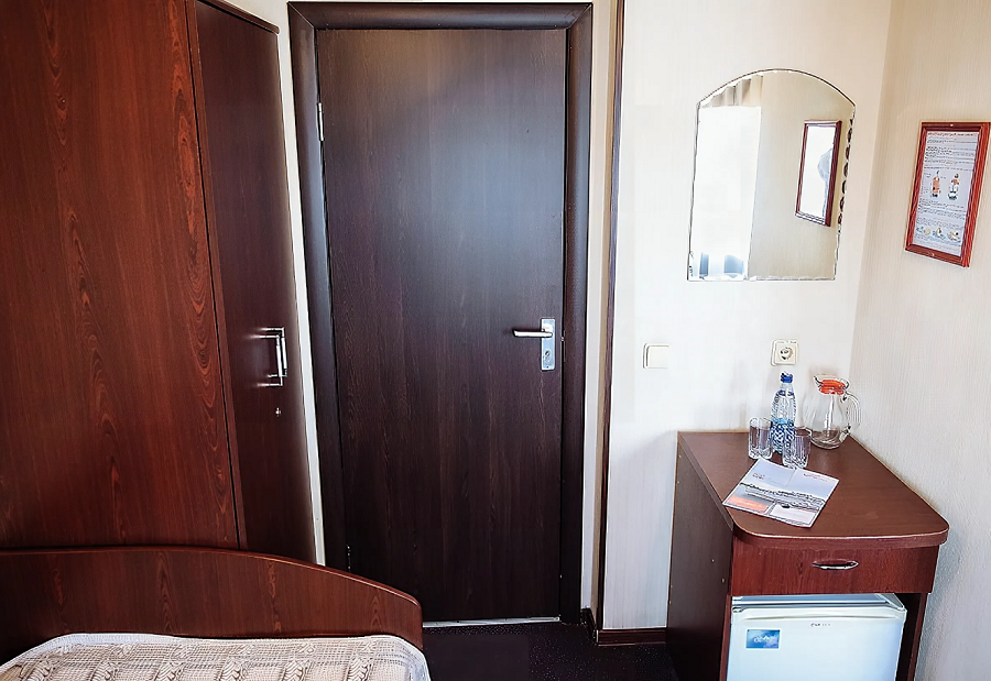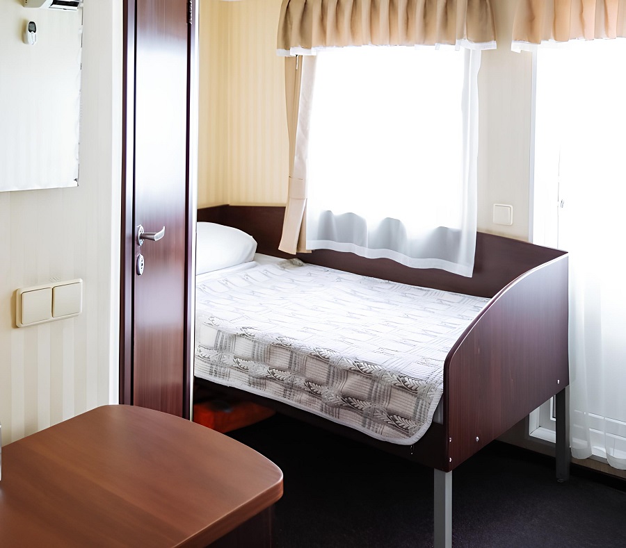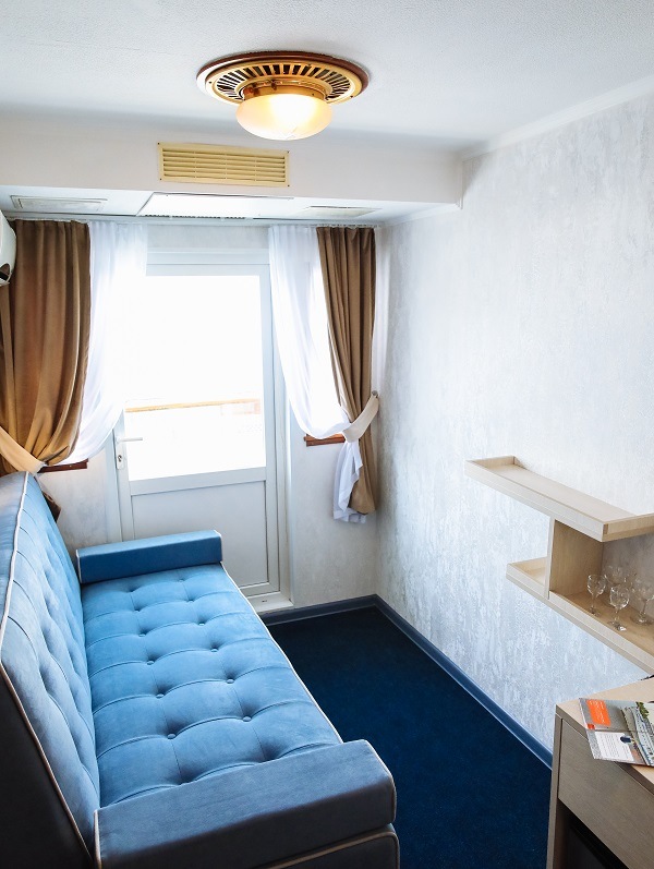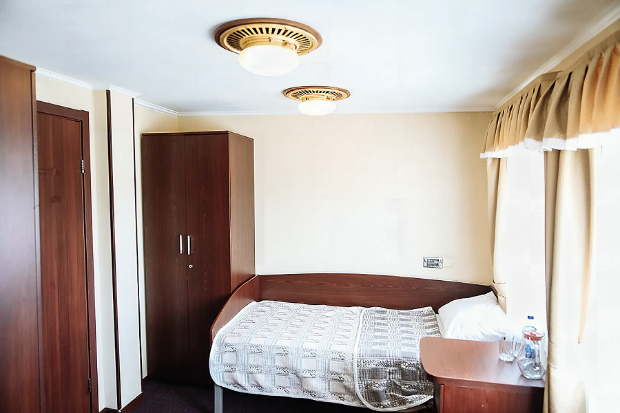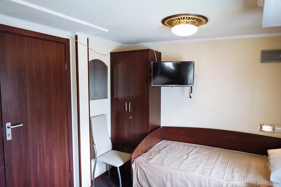 В каюте: односпальная кровать, двухъярусная кровать, ванная комната (раковина, душевая кабина, туалет), шкаф для одежды, тумба, надкроватные светильники, холодильник, кондиционер, графин, радио, иллюминатор.