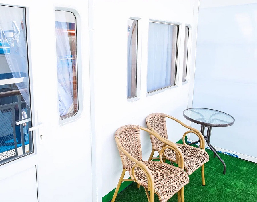 В каюте: две односпальные кровати, ванная комната (душевая кабина, туалет, раковина), шкаф для одежды, фен, туалетные принадлежности, чайник, прикроватная тумбочка, журнальный столик, комод, холодильник, кондиционер, радио, раскладной диван, персональный балкон с мебелью для отдыха.