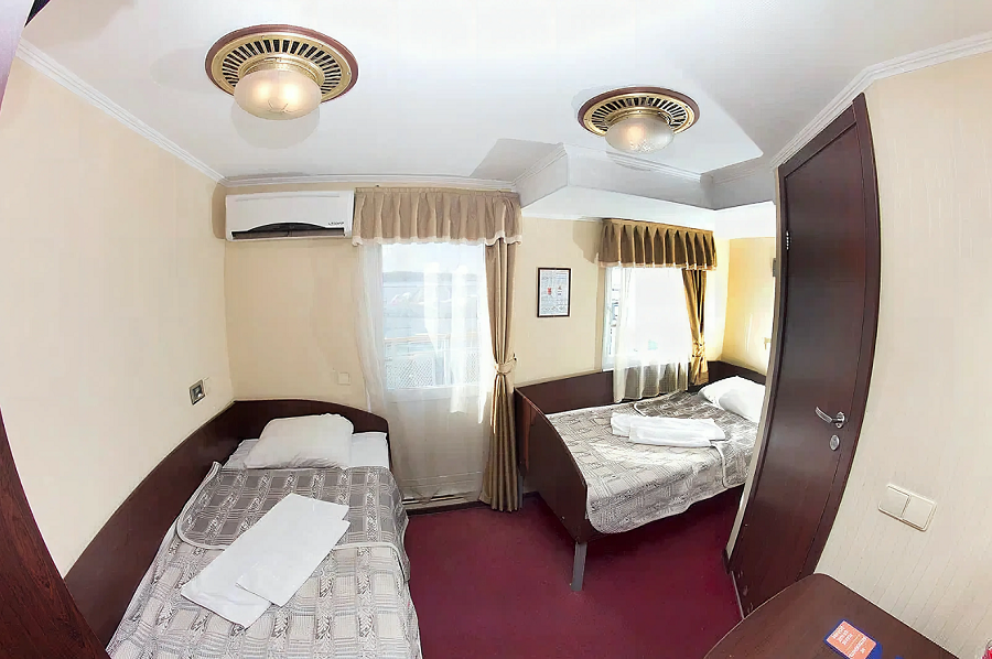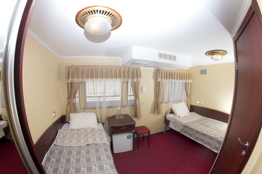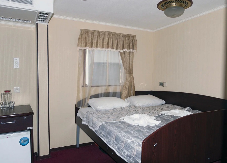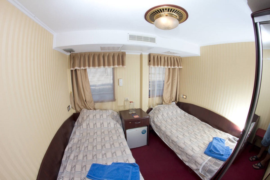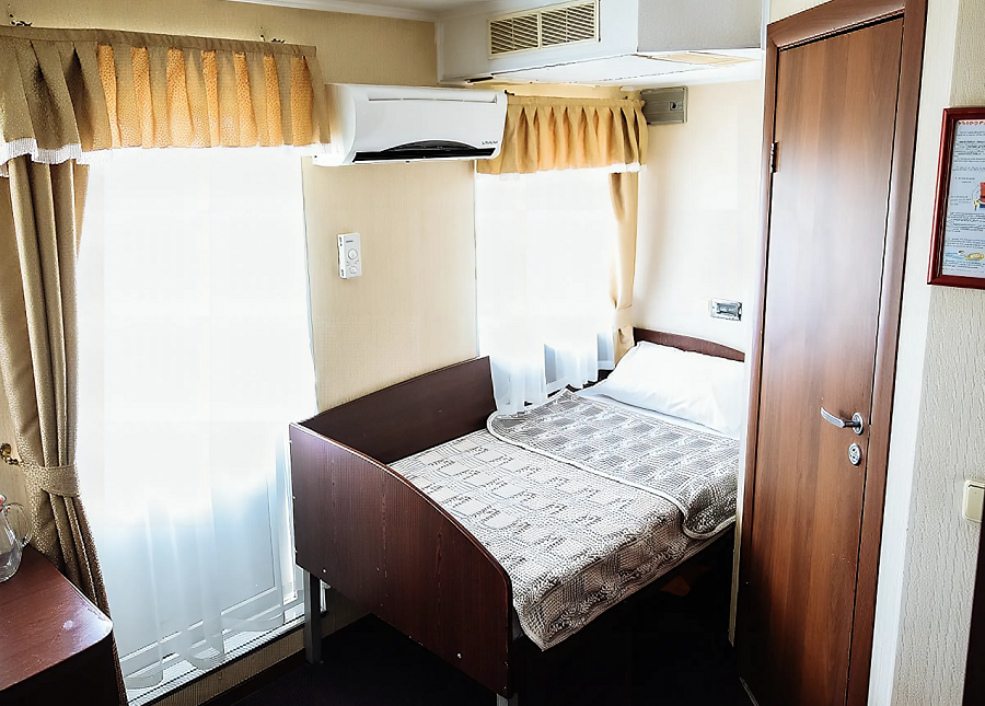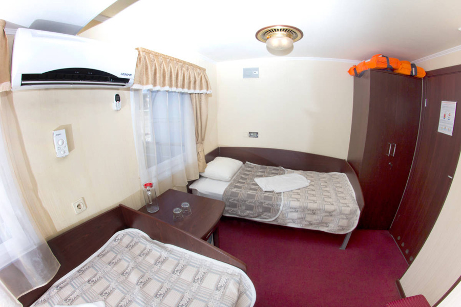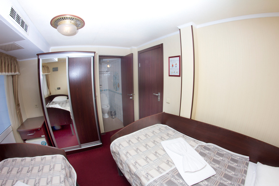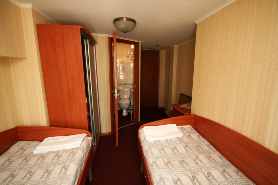 В каюте: две односпальные кровати, ванная комната (раковина, душевая кабина, туалет), шкаф для одежды, тумба, надкроватные светильники, холодильник, кондиционер, радио, графин, иллюминатор.