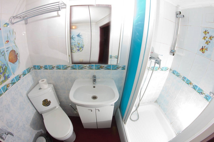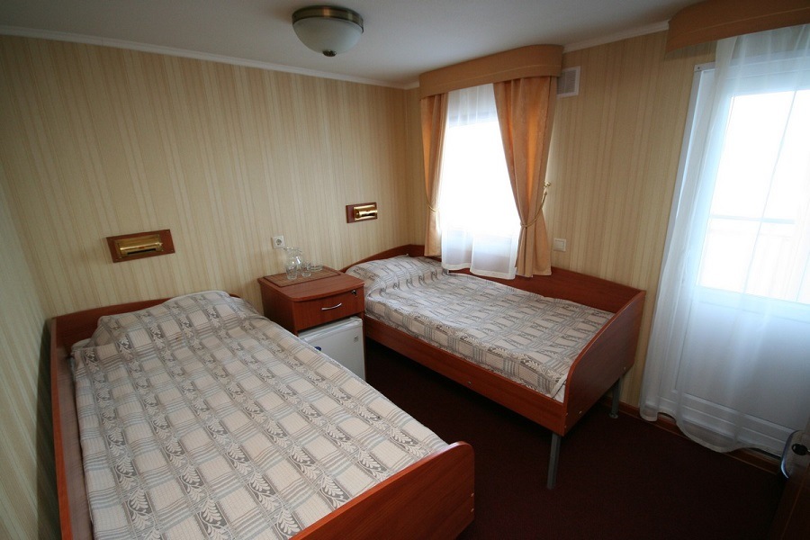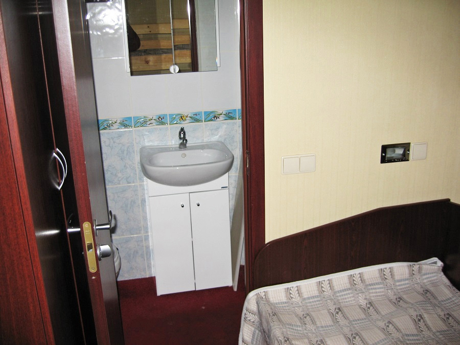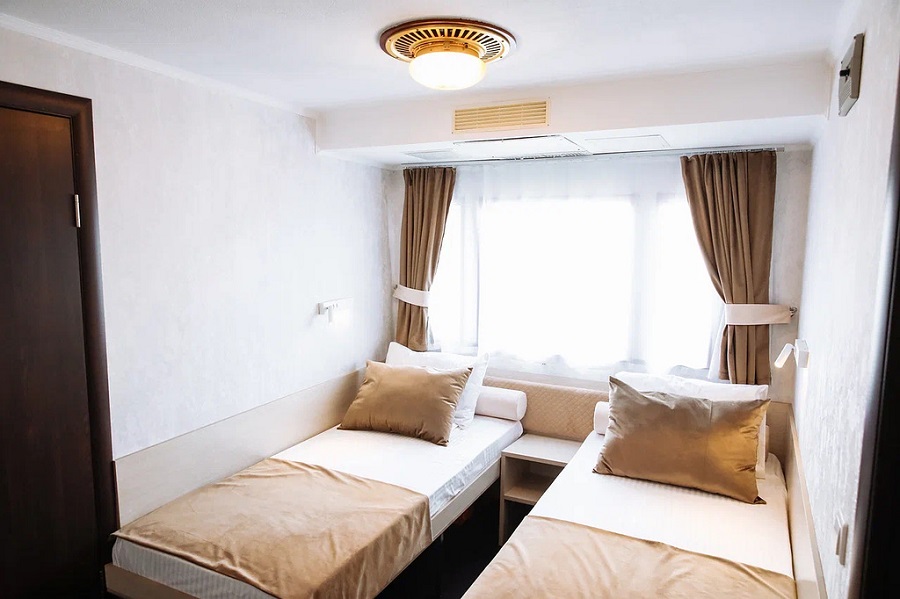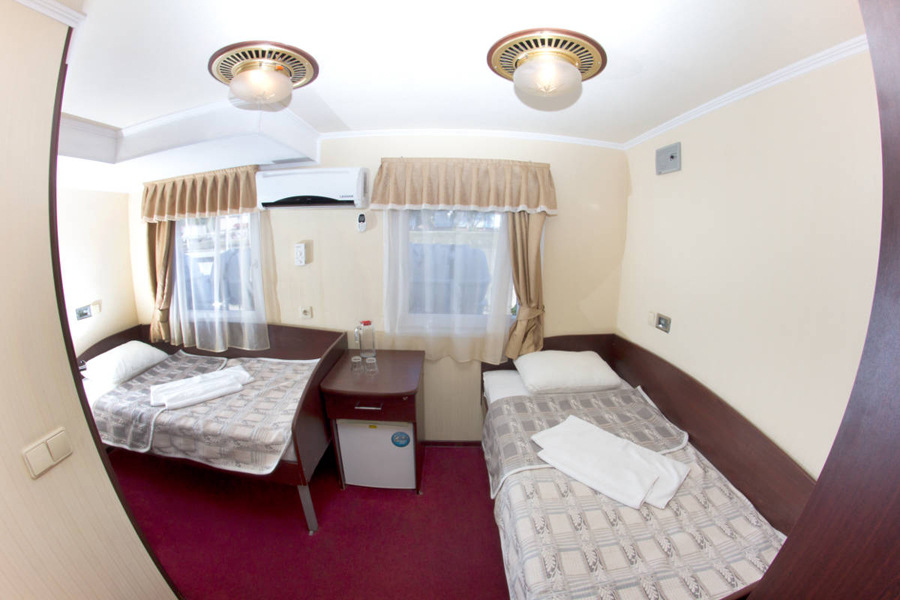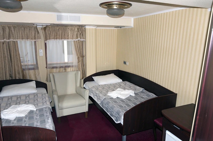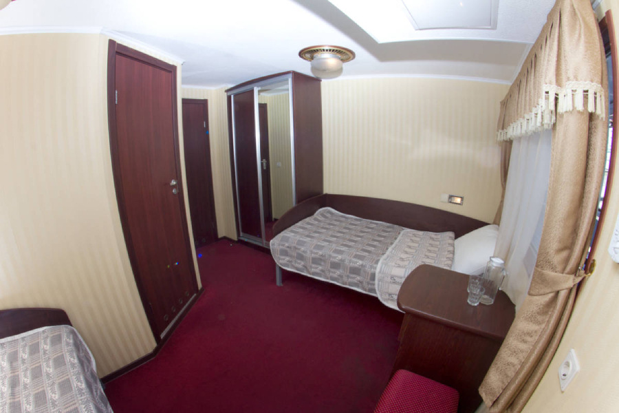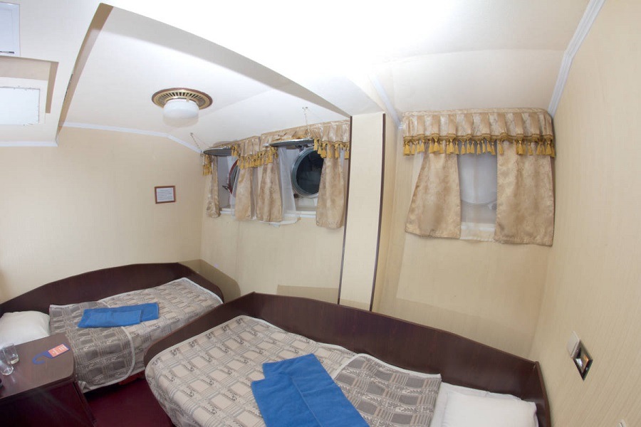В каюте: две односпальные кровати, ванная комната (раковина, душевая кабина, туалет), шкаф для одежды, тумба, надкроватные светильники, холодильник, кондиционер, радио, графин, иллюминатор.