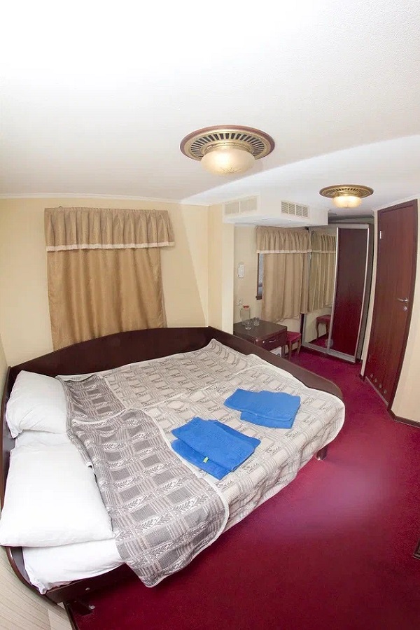 В каюте: двуспальная кровать, ванная комната (раковина, душевая кабина, туалет), шкаф для одежды, тумба, журнальный столик, надкроватные светильники, холодильник, кондиционер, радио, графин.