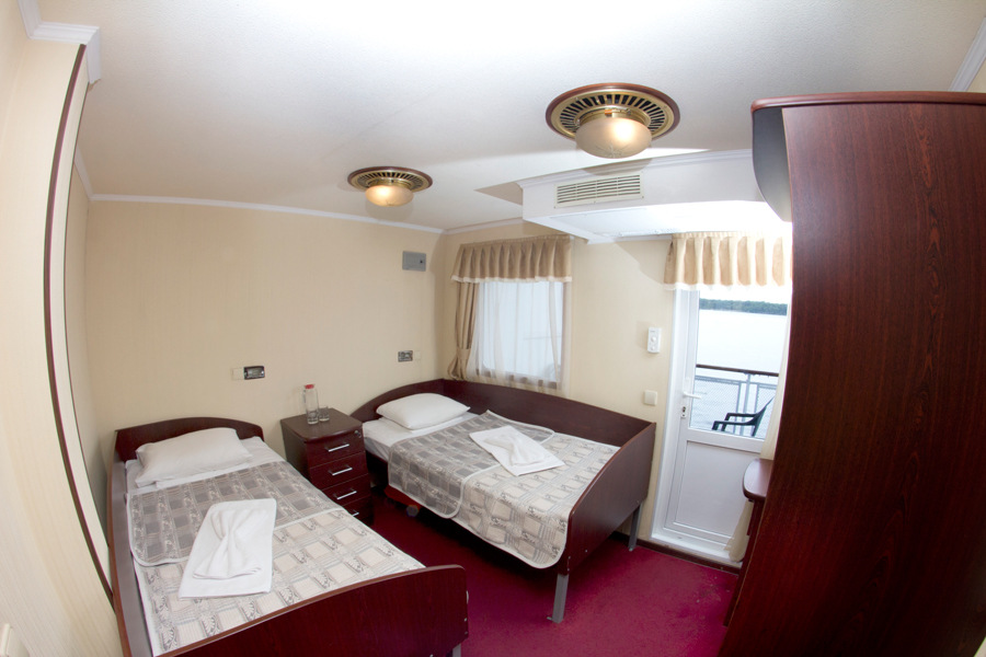 В каюте: две односпальные кровати, ванная комната (раковина, душевая кабина, туалет), шкаф для одежды, тумба, надкроватные светильники, холодильник, кондиционер, радио,графин, два обзорных окна.