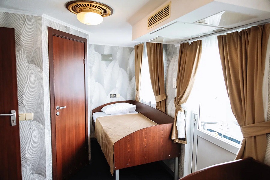 В каюте: односпальная кровать, ванная комната (раковина, душевая кабина, туалет), шкаф для одежды, тумба, холодильник, кондиционер, надкроватные светильники, радио, графин, обзорное окно.