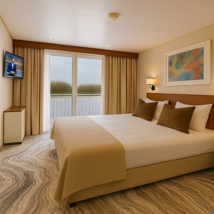 В каюте: две односпальные кровати, ванная комната (раковина, душ, туалет), комплект полотенец, фен, шкаф для одежды, холодильник, спутниковое телевидение, телефон внутренней связи, радио, сейф, кондиционер, стеклянная балконная дверь, французский балкон.