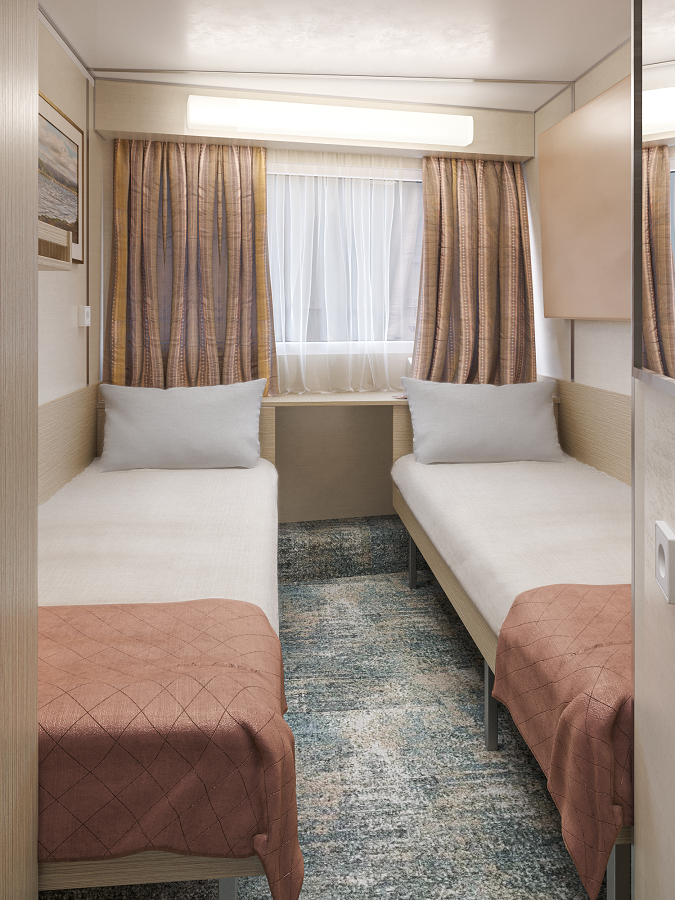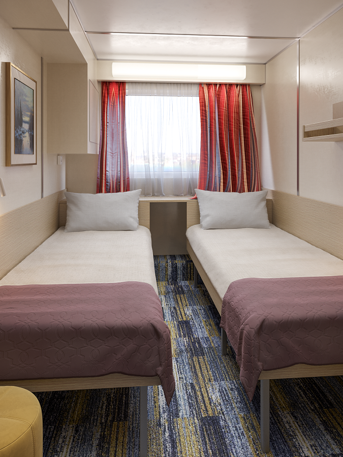 В каюте: двухъярусная кровать, ванная комната (раковина, душ, туалет), шкаф для одежды, зеркало, радио, кондиционер, розетка 220V, обзорное окно.