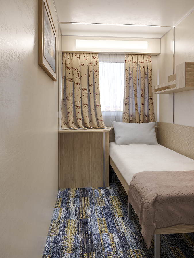 В каюте: односпальная кровать, ванная комната (раковина, душ, туалет), шкаф для одежды, радио, кондиционер, зеркало, розетка 220V, обзорное окно.