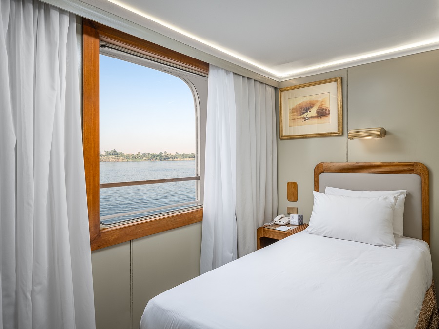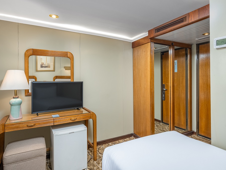 В каюте: односпальная кровать, ванная комната (раковина, душевая кабина, туалет), кондиционер с отдельным блоком управления, спутниковое телевидение, сейф, фен, туалетные принадлежности, мини-бар, питьевая вода, телефон, обзорное окно.