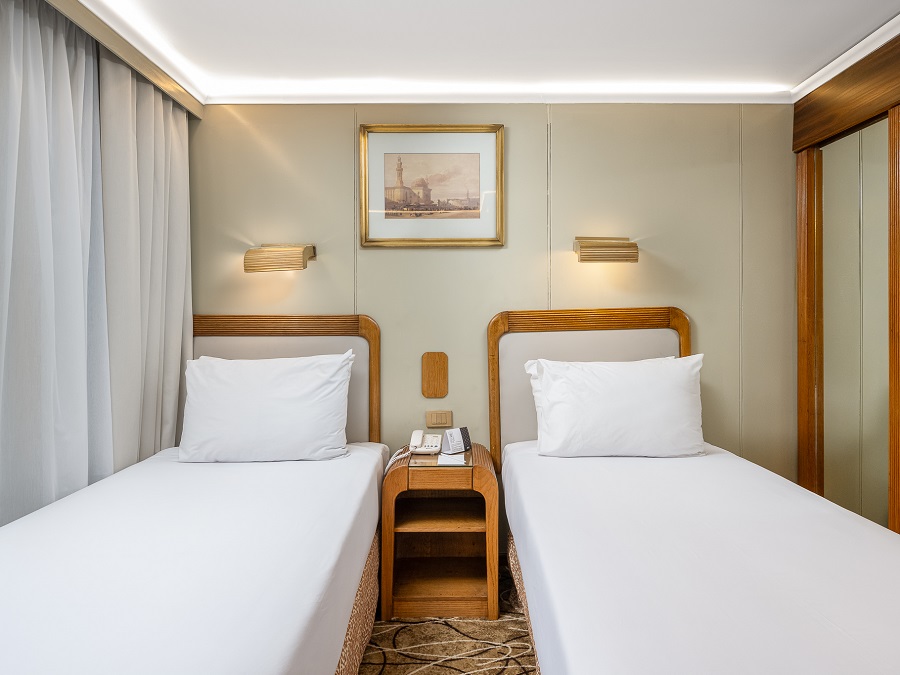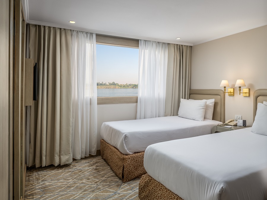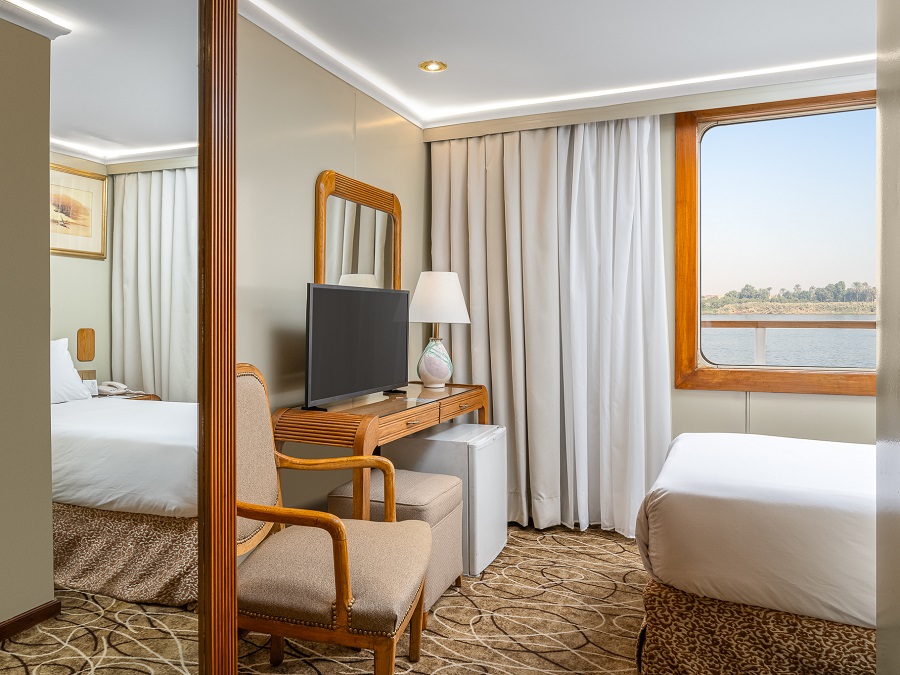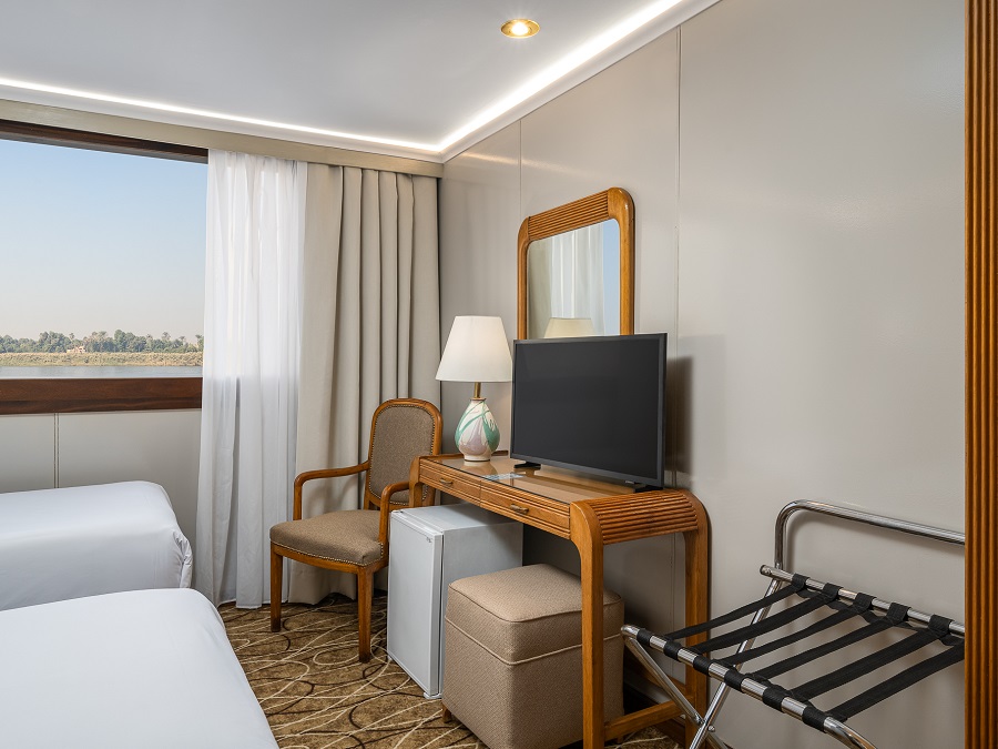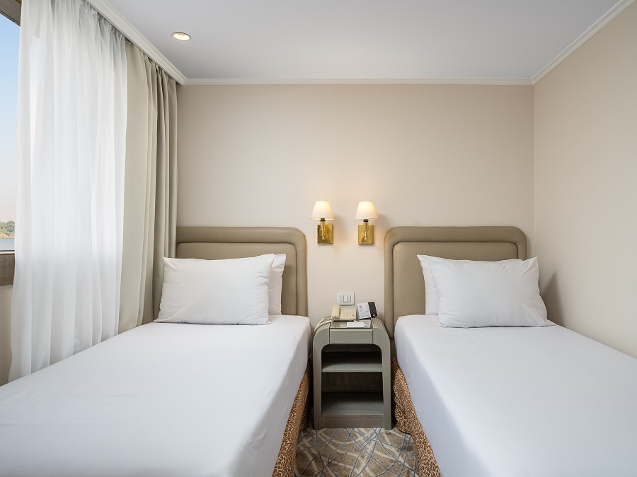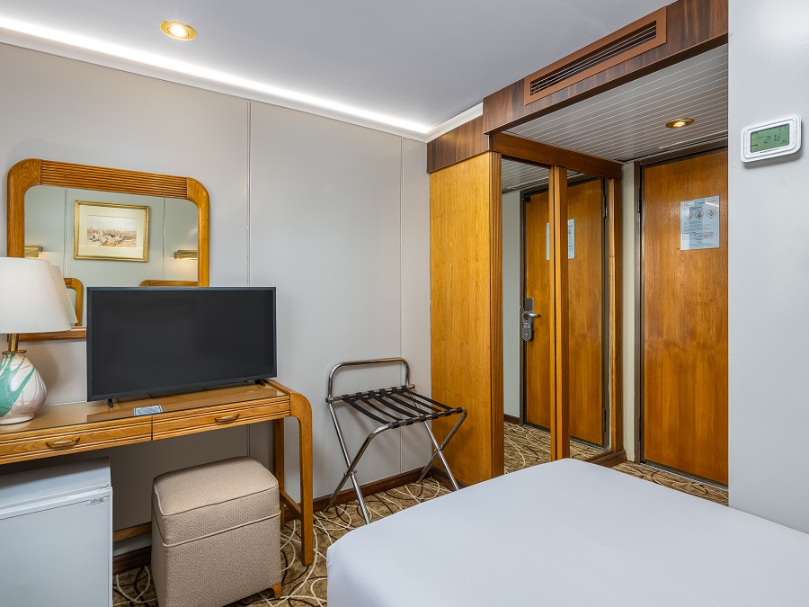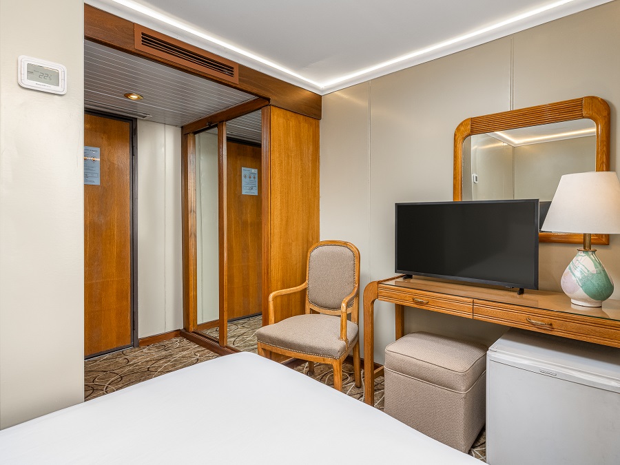 В каюте: две односпальные кровати (при необходимости трансформируются в двуспальную кровать), ванная комната (раковина, душевая кабина, туалет), кондиционер с отдельным блоком управления, спутниковое телевидение, сейф, фен, туалетные принадлежности, мини-бар, питьевая вода, телефон, обзорное окно.