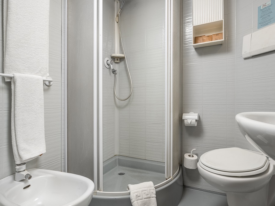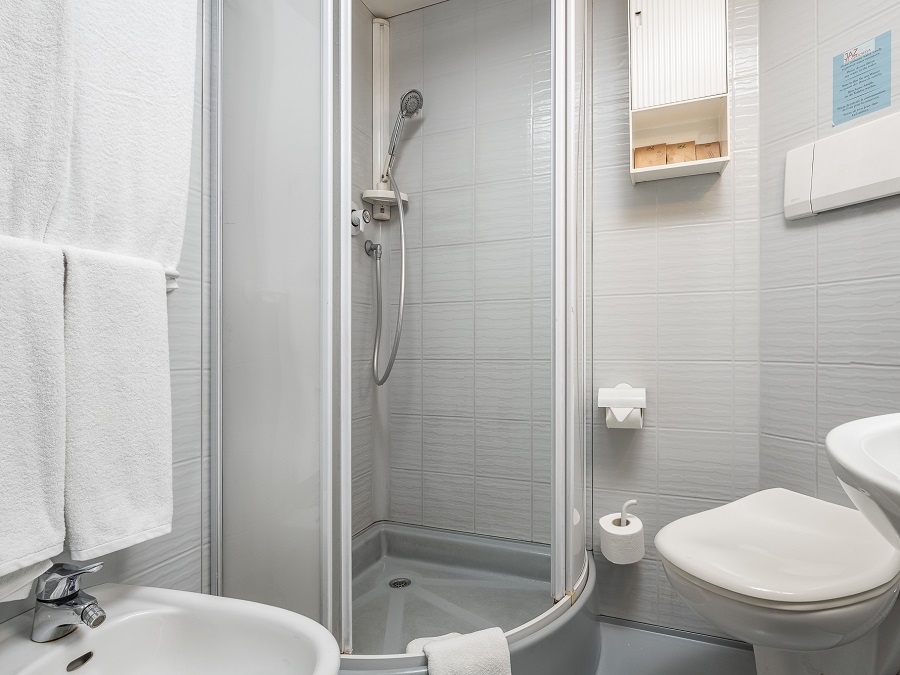 Ванная комната оборудована душевой кабиной, раковиной, туалетом и феном.