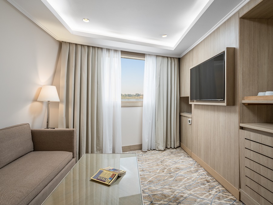 В каюте: одна двуспальная кровать (при необходимости трансформируется в две односпальные кровати), диван, ванная комната (раковина, душевая кабина, туалет), кондиционер с отдельным блоком управления, спутниковое телевидение, сейф, фен, туалетные принадлежности, мини-бар, питьевая вода, телефон, обзорное окно.