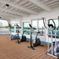 В каюте: одна двуспальная кровать, ванная комната (раковина, душевая кабина, туалет), кондиционер, шкаф, телевизор, фен, сейф, мини-холодильник, радио, розетка 220V, телефон внутренней связи, обзорное окно, стеклянная балконная дверь, персональный балкон с мебелью для отдыха.