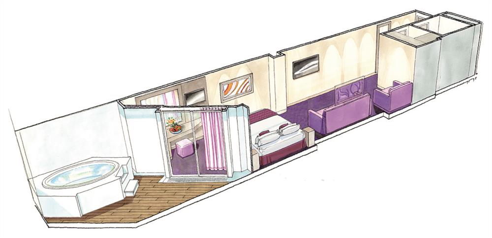В каюте: большая двуспальная кровать, зона гостиной с диваном, ваннаа комната (раковина, душ, ванна, туалет), гардеробная, фен, мини-бар (включен в стоимость), сейф, кондиционер, кофемашина, интерактивное TV, беспроводной интернет (безлимитный интернет-пакет Browse cruise package на 2 устройства), персональный балкон с мебелью для отдыха и джакузи.