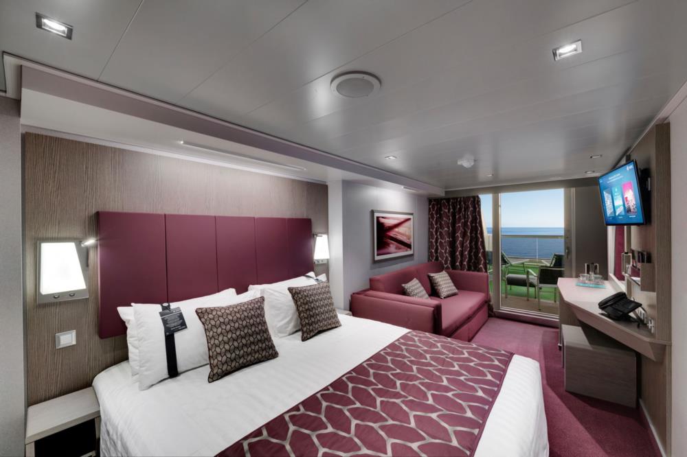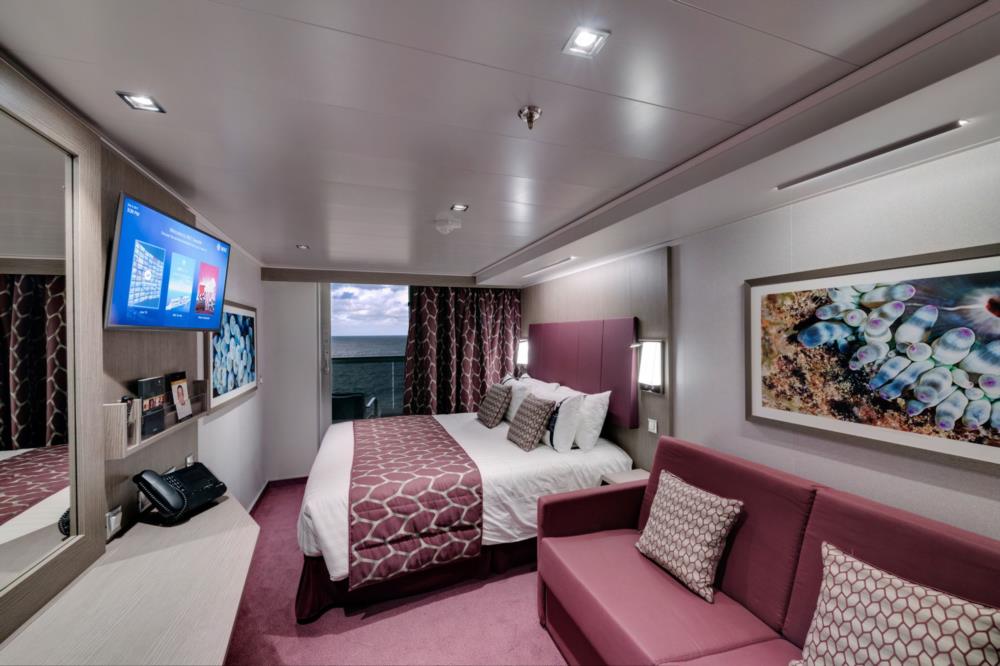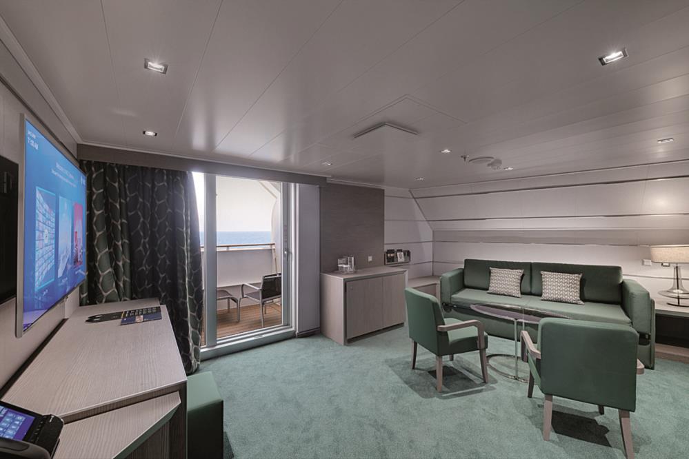 В каюте: две односпальные кровати (при необходимости трансформируются в двуспальную кровать), зона гостиной с диваном, ванная комната (раковина, душевая кабина, туалет), телефон, фен, мини-бар (включен в стоимость), сейф, кондиционер, кофемашина, интерактивное TV, беспроводной интернет (безлимитный интернет-пакет Browse cruise package на 2 устройства), персональный балкон с мебелью для отдыха.