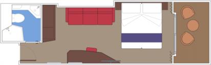 В каюте: две односпальные кровати (при необходимости трансформируются в двуспальную кровать), зона гостиной с диваном, ванная комната (раковина, ванна, туалет), ванная комната (раковина, душ, туалет), телефон, фен, мини-бар, сейф, кондиционер, интерактивное TV, беспроводной интернет (оплачивается дополнительно), персональный балкон с мебелью для отдыха.