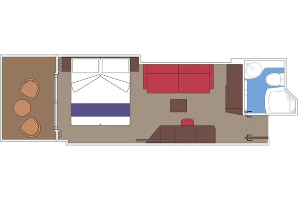 В каюте: две односпальные кровати (при необходимости трансформируются в двуспальную кровать), диван, ванная комната (раковина, душ, туалет), телефон, фен, мини-бар (включен в стоимость), сейф, кондиционер, интерактивное TV, беспроводной интернет (безлимитный интернет-пакет Browse cruise package на 2 устройства), персональный балкон с мебелью для отдыха.