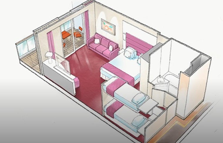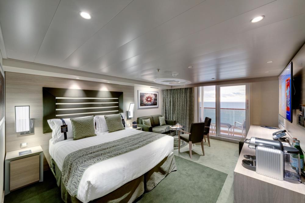 В каюте: две односпальные кровати (при необходимости трансформируются в двуспальную кровать), зона гостиной с диваном, ванная комната (раковина, душ, туалет), гардеробная, телефон, фен, мини-бар (включен в стоимость), сейф, кондиционер, кофемашина, интерактивное TV, беспроводной интернет (безлимитный интернет-пакет Browse cruise package на 2 устройства), виртуальный персональный круизный ассистент ZOE, персональный балкон с мебелью для отдыха.