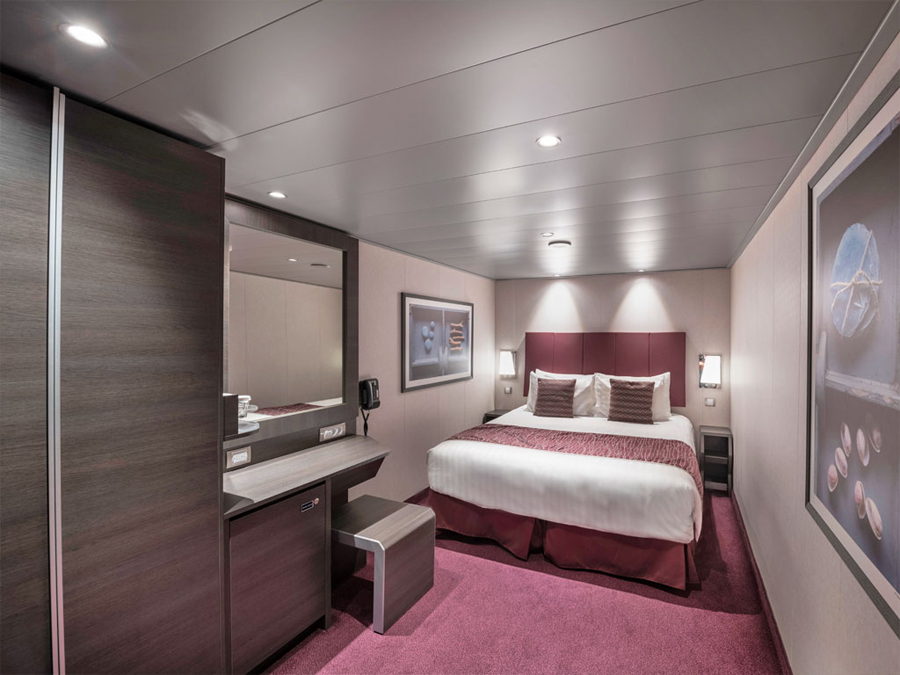 В каюте: две односпальные кровати (при необходимости трансформируются в двуспальную кровать), ванная комната (раковина, душ, туалет), телефон, фен, мини-бар, сейф, кондиционер, интерактивное TV, беспроводной интернет (оплачивается дополнительно), виртуальный персональный круизный ассистент ZOE, каюта без окна.