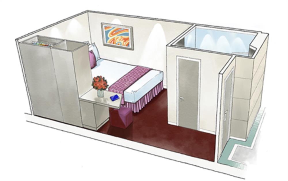 В каюте: односпальная кровать, ванная комната (раковина, душ, туалет), телефон, фен, мини-бар, сейф, кондиционер, интерактивное TV, беспроводной интернет (оплачивается дополнительно), виртуальный персональный круизный ассистент ZOE, каюта без окна.