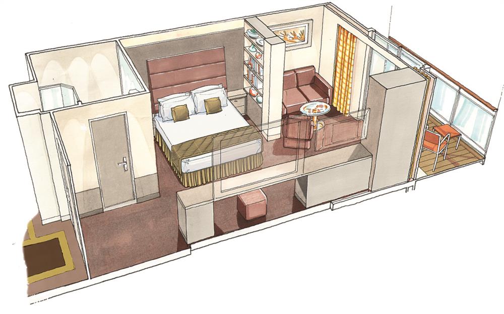 В каюте: две односпальные кровати (при необходимости трансформируются в двуспальную кровать), зона гостиной с диваном, ванная комната (раковина, душ, туалет), гардеробная, телефон, фен, мини-бар, сейф, кондиционер, интерактивное TV, беспроводной интернет (оплачивается дополнительно), виртуальный персональный круизный ассистент ZOE, угловой балкон с персональным джакузи.