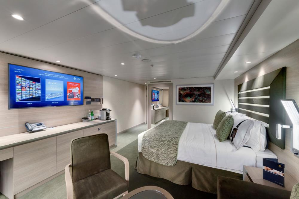 В каюте: две односпальные кровати (при необходимости трансформируются в двуспальную кровать), двуспальный раскладной диван, ванная комната (раковина, душ, туалет), телефон, фен, мини-бар, сейф, кондиционер, интерактивное TV, беспроводной интернет (оплачивается дополнительно), виртуальный персональный круизный ассистент ZOE, обзорное окно (не открывается).
