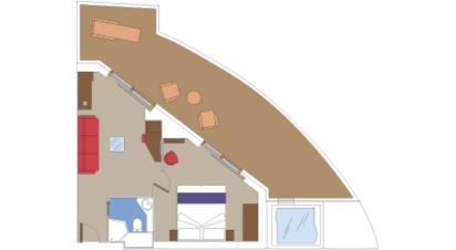 В каюте: две односпальные кровати (при необходимости трансформируются в двуспальную кровать), зона гостиной с диваном, ванная комната (раковина, душ, туалет), телефон, фен, мини-бар, сейф, кондиционер, интерактивное TV, беспроводной интернет (оплачивается дополнительно), виртуальный персональный круизный ассистент ZOE, угловой балкон с персональным джакузи.