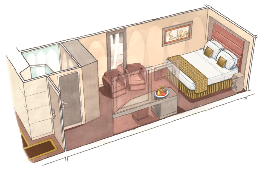В каюте: две односпальные кровати (при необходимости трансформируются в двуспальную кровать), Ванная комната (раковина, душ, туалет), телефон, фен, мини-бар, сейф, кондиционер, интерактивное TV, беспроводной Интернет (оплачивается дополнительно), каюта без окна.