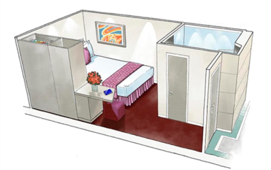 В каюте: две односпальные кровати (при необходимости трансформируются в двуспальную кровать), ванная комната (раковина, душ, туалет), телефон, фен, мини-бар (включен в стоимость), сейф, кондиционер, кофемашина, интерактивное TV, беспроводной интернет (безлимитный интернет-пакет Browse cruise package на 2 устройства), виртуальный персональный круизный ассистент ZOE, каюта без окна.