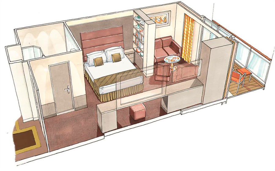 В каюте: однаоспальная кровать, ванная комната (раковина, душ, туалет), телефон, фен, мини-бар, сейф, кондиционер, интерактивное TV, беспроводной интернет (оплачивается дополнительно), виртуальный персональный круизный ассистент ZOE, персональный балкон с мебелью для отдыха.