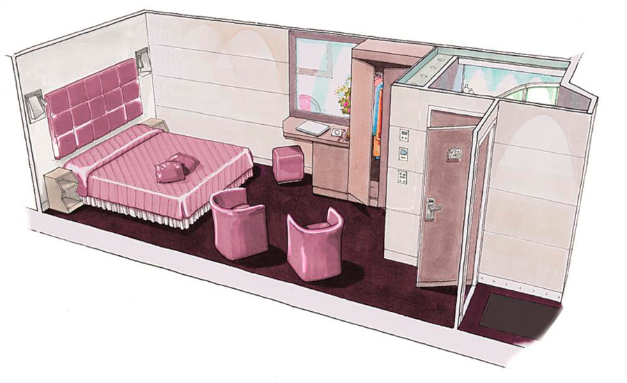 В каюте: две односпальные кровати (при необходимости трансформируются в двуспальную кровать), ванная комната (раковина, душ, туалет), телефон, фен, мини-бар, сейф, кондиционер, интерактивное TV, беспроводной интернет (оплачивается дополнительно), виртуальный персональный круизный ассистент ZOE, обзорное окно (не открывается).