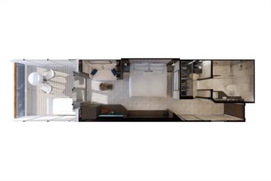В каюте: двуспальная кровать, лаундж-зона с журнальным столиком и диваном, ванная комната (раковина, душевая кабина, туалет), телевизор, кофемашина и чайная станция, мини-бар, бутылка воды на каждого гостя, пара биноклей (на время пребывания в круизе), сейф (вмещающий ноутбук или планшет), халаты, тапочки, фен, зеркало, гардеробная с туалетным столиком, персональный балкон с мебелью для отдыха.