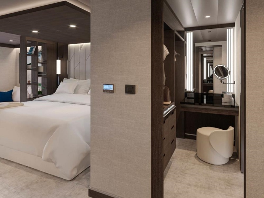 В каюте: двуспальная кровать, лаундж-зона с журнальным столиком и диваном, ванная комната (раковина, душ, туалет), телевизор, кофемашина и чайная станция, мини-бар, бутылка воды на каждого гостя, пара биноклей (на время пребывания в круизе), сейф (вмещающий ноутбук или планшет), халаты, тапочки, фен, зеркало, гардеробная с туалетным столиком, персональный балкон с мебелью для отдыха.