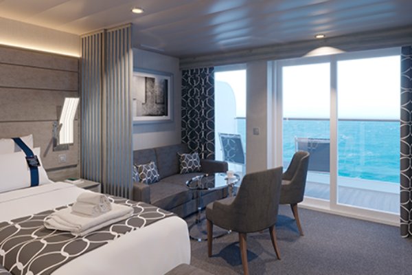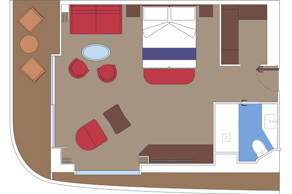 В каюте: большая двуспальная кровать, гостиная с раскладным диваном, ванная комната (раковина, душ, ванна, туалет), гардеробная, телефон, фен, мини-бар (включен в стоимость), сейф, кондиционер, кофемашина, интерактивное TV, беспроводной интернет (безлимитный интернет-пакет Browse cruise package на 2 устройства), персональный балкон с мебелью для отдыха джакузи.